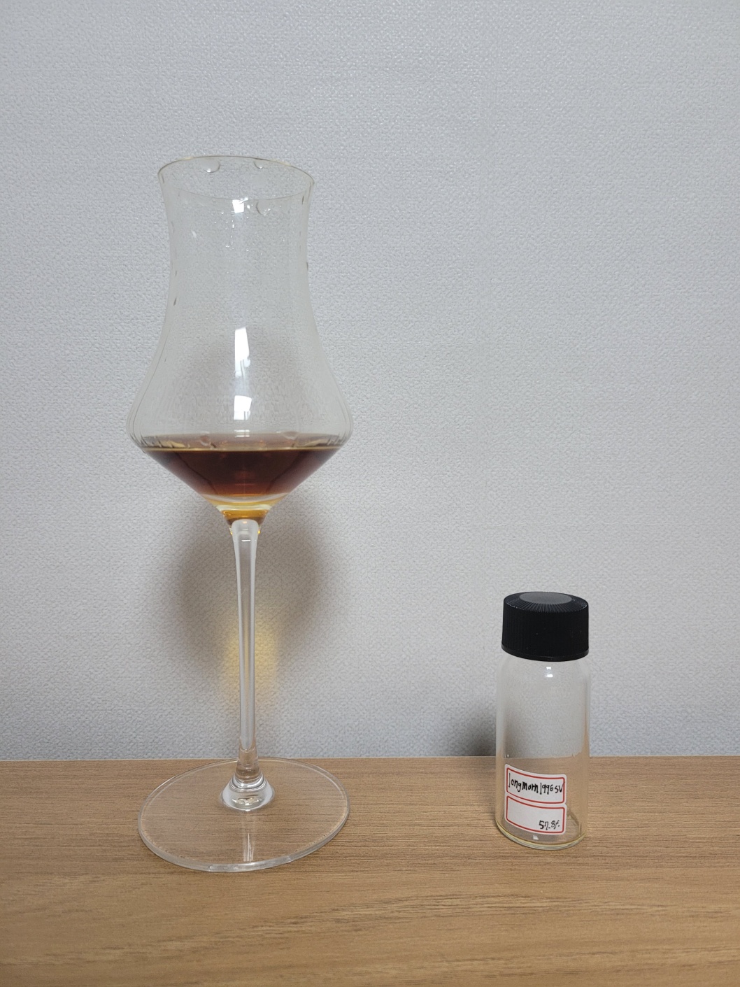 향: 알코올이 강하게 치대며 네일 리무버스러운 아세톤 뉘앙스와 약피트에서 오는 페놀릭 한 느낌이 있다. 일본에서도 남부 지역에서 생산하는 몰트 위스키의 장향형 고량주의 느낌이 살포시 얹어져 있다. 황(Sulfur)내가 없다시피 하다. 가볍게 구워낸 파인애플의 시트러스를 비롯해 블랙체리, 반건조 무화과, 블루베리 시럽, 적포도 껍질, 푸룬, 럼레이즌, 다크초콜릿 향이 정직하고도 가지런하다. 강렬한 오크터치로 계피스틱을 오래 태운 듯한 향이 올라오며 정향과 흑후추가 지배적이다.