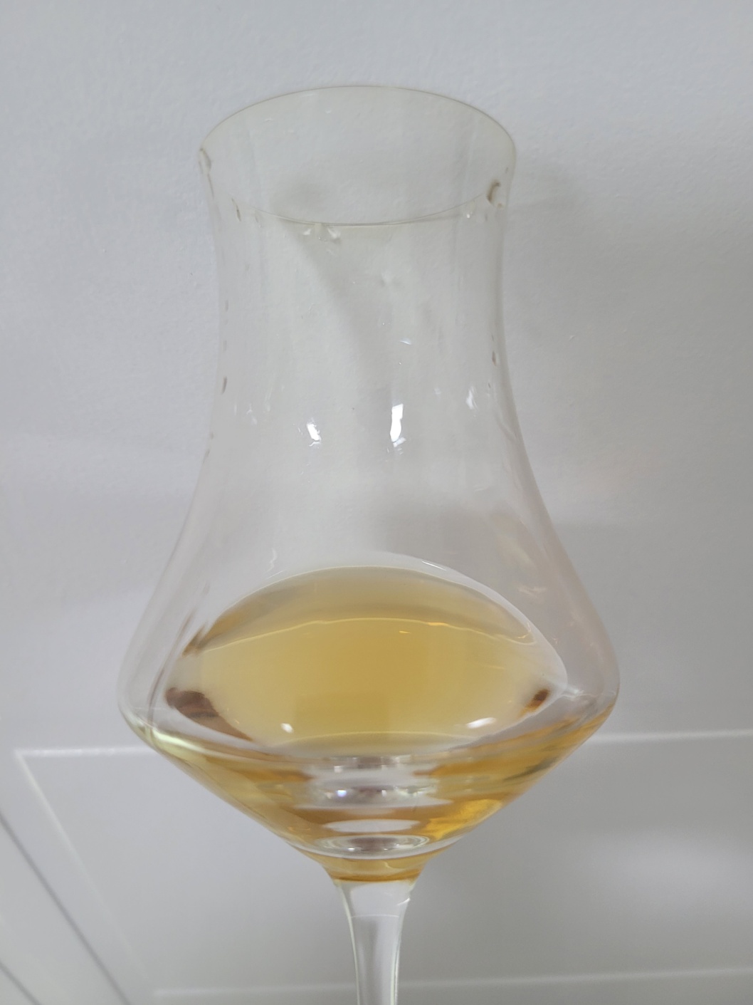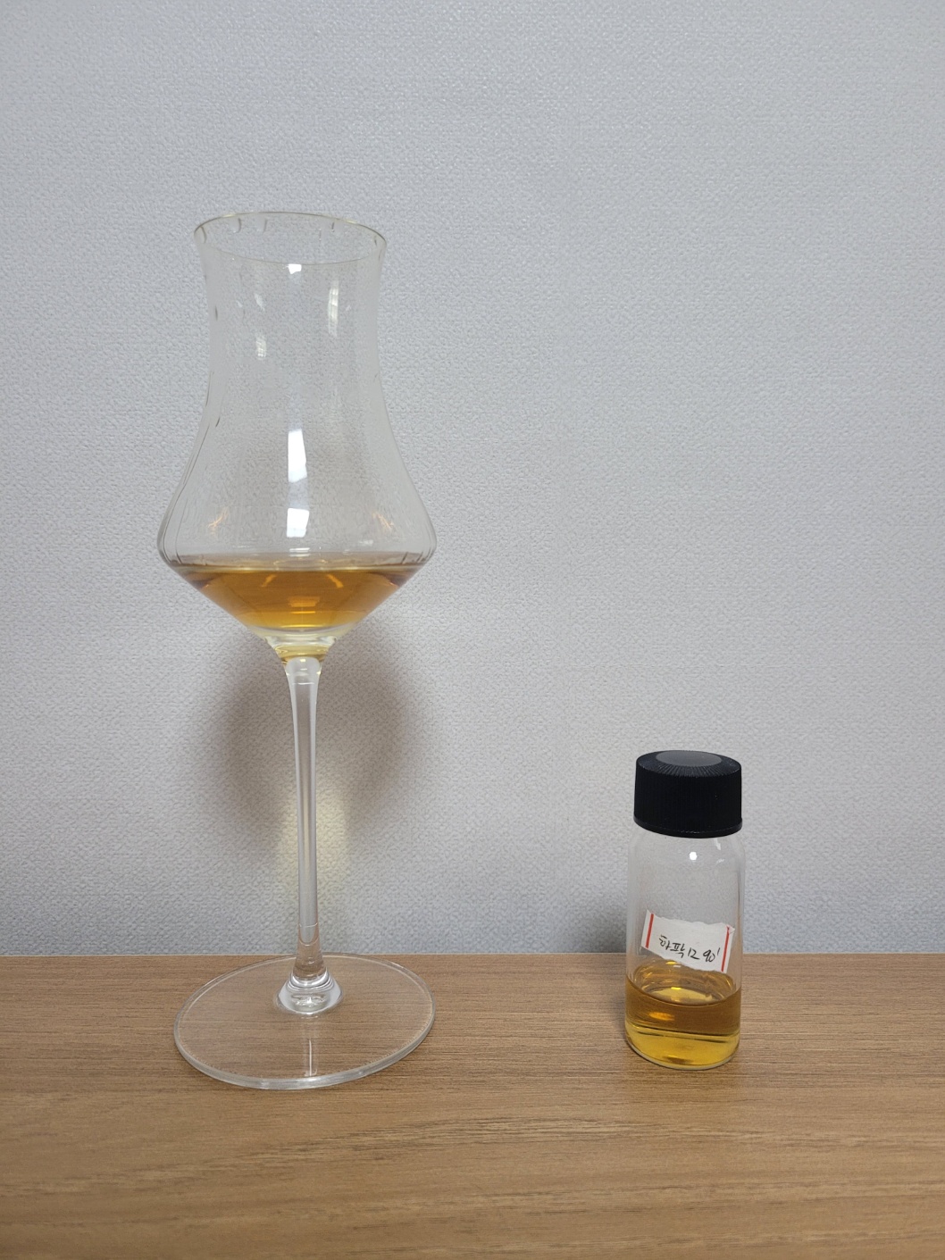 목 넘김 및 여운: 부드러운 목 넘김이다. 마른 신문지, 반건조 무화과, 스카치캔디, 바닐라, 토피, 조청, 설탕에 조린 사과 따위가 비강을 가득 메운 뒤, 사과나무 훈연칩의 스모키와 은은한 라벤더가 가늘고 짧게 이어진다. 혀에는 솔티드 캐러멜의 짠맛과 단맛 그리고 국시장국의 은은한 감칠맛이 남는다.