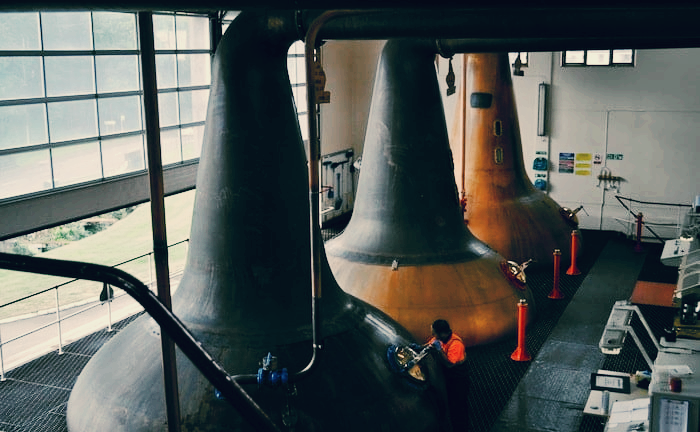 워시는 워시 스틸에서 약 7시간 동안 가열 & 농축되어 알코올 도수 약 24 ~ 27%의 로우 와인(Low Wine)이 된다. 로우 와인은 다시 스피릿 스틸에서 약 7시간 동안 가열 & 농축된 후 스피릿 세이프에서 미들컷 과정을 거친다. 초류와 후류는 재증류되고, 본류만을 수집하면 알코올 도수 약 70 ~ 73%의 뉴 메이크 스피릿이 탄생한다. 연간 약 400만 리터의 순수 알코올을 생산한다.