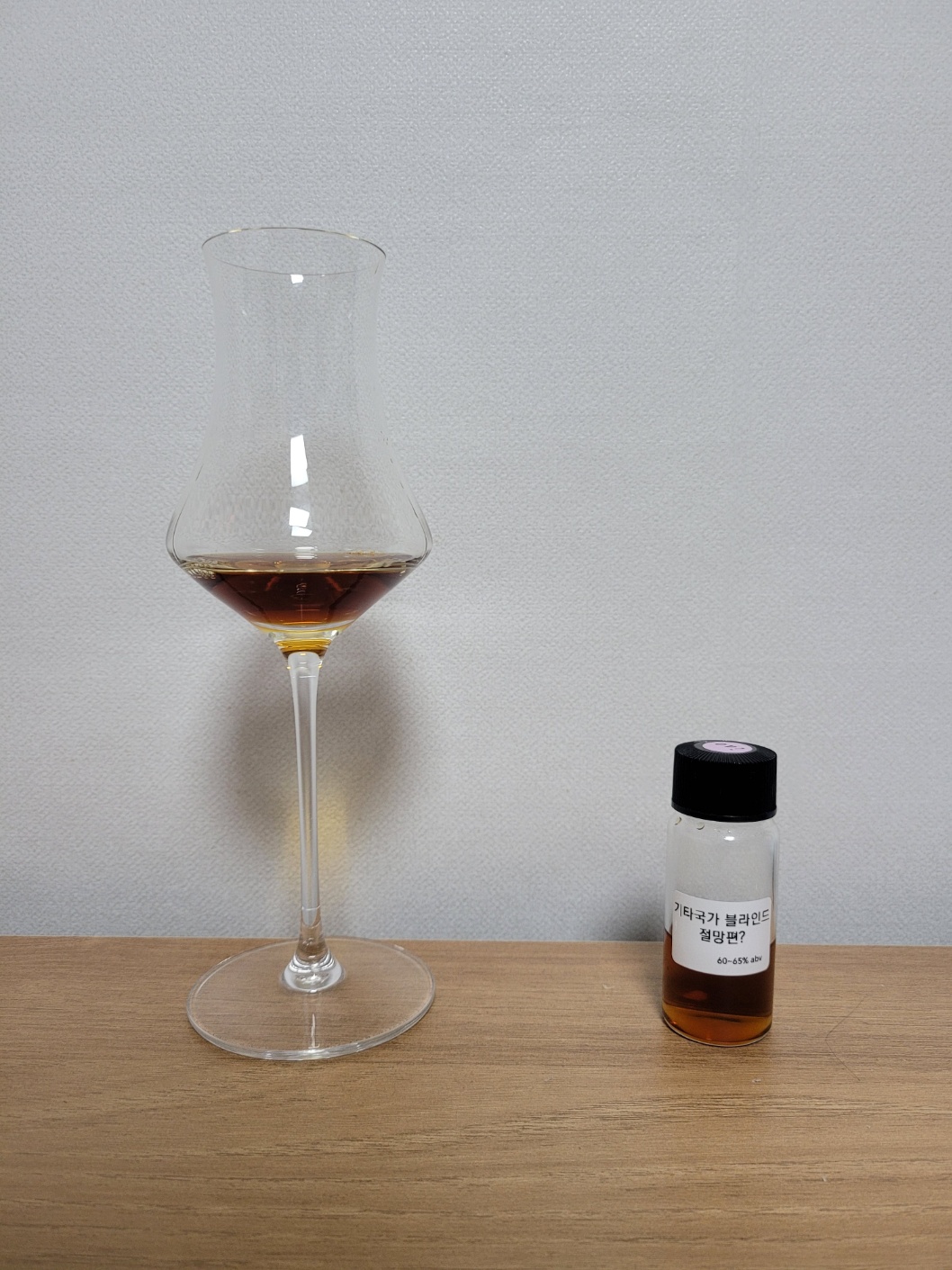 맛: 물 같은 질감에 중간 정도의 바디감이다. 피의 묘한 철분 뉘앙스, 블러드오렌지나 자몽 과육의 시큼하면서도 씁쓸한 풍미, 강렬한 오크터치에서 기인하는 탄닌 떫은맛이 두껍게 내려앉는다. 말린 정향, 그라인더로 곱게 갈린 흑후추, 소금을 섞은 듯한 묘한 짠맛과 알싸함이 진득하게 훑고 지나가면 실수로 살짝 태운 누룽지를 비롯해 무화과잼, 건포도가 알알이 붙은 모카번, 콜드 브루, 카카오닙스의 풍미가 느껴진다. 가쓰오다시 원액의 진한 감칠맛이 말린 과일의 단맛과 함께 증폭된다. 오래 머금을수록 그 영향이 줄어들고 탄맛과 쓴맛이 올라오면서 균형감이 급격하게 떨어진다. 풍미 자체가 알코올의 볼륨을 압도하지만 너무 강하게 지속되어 피로감이 상당하다.