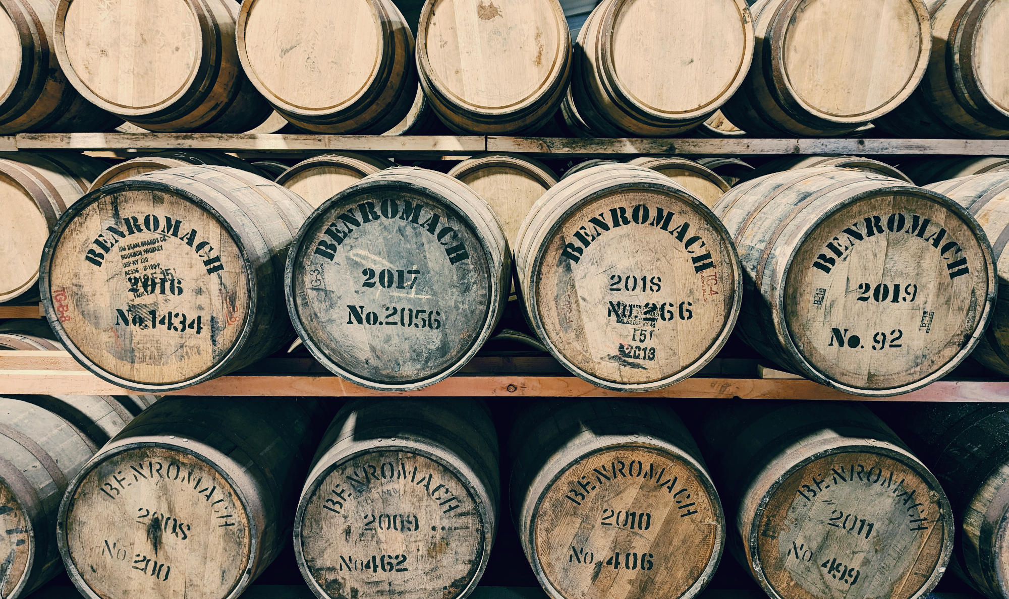뉴 메이크 스피릿은 "Romach Hills"의 샘물을 통해 알코올 도수 약 63.5%로 가수 된 후 다양한 오크에 통입된다. 벤로막 증류소는 보다 견고하면서 풍부한 캐릭터를 부여하기 위해 퍼스트 필 캐스크만을 활용한다. 전체 생산량의 80%는 이전에 잭 다니엘을 숙성시켰던 아메리칸 오크에, 나머지 20%는 이전에 셰리 또는 와인을 숙성시켰던 아메리칸 오크 및 유러피안 오크에 통입한다.