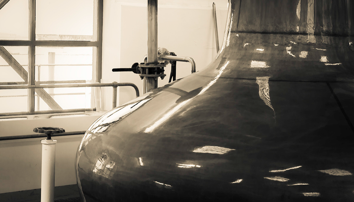 워시는 워시 스틸에서 1차적으로 가열 & 농축되어 알코올 도수 약 20 ~ 23%의 로우 와인(Low Wine)이 생성된다. 이후 로우 와인은 스피릿 스틸에서 2차적으로 가열 & 농축된 후 스피릿 세이프에서 약 74 ~ 60.8%로 컷을 잡아 평균 알코올 도수 약 70%의 뉴 메이크 스피릿 또는 뉴 팟이 탄생한다. 연간 약 70만 리터의 순수 알코올을 생산한다.