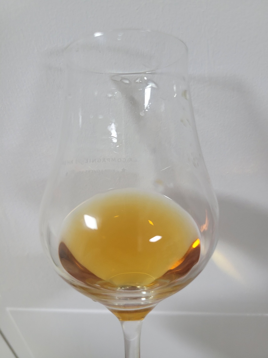 목 넘김 및 여운: 도수 대비 부드럽지는 않지만 산뜻한 느낌이 있다. 알코올이 가볍게 터진 후 육두구, 시나몬, 오렌지 껍질, 베르가못, 말린 코코넛칩 그리고 씁쓸한 가루약 뉘앙스가 비강에 잠시 머물다가 빠르게 사라진다. 혀에는 오크보다 과일 껍질에서 오는 보다 텁텁한 느낌의 탄닌감으로 엷게 코팅되며 건살구의 단맛과 귤락의 씁쓸함이 내려앉아 가늘고 길게 이어진다.