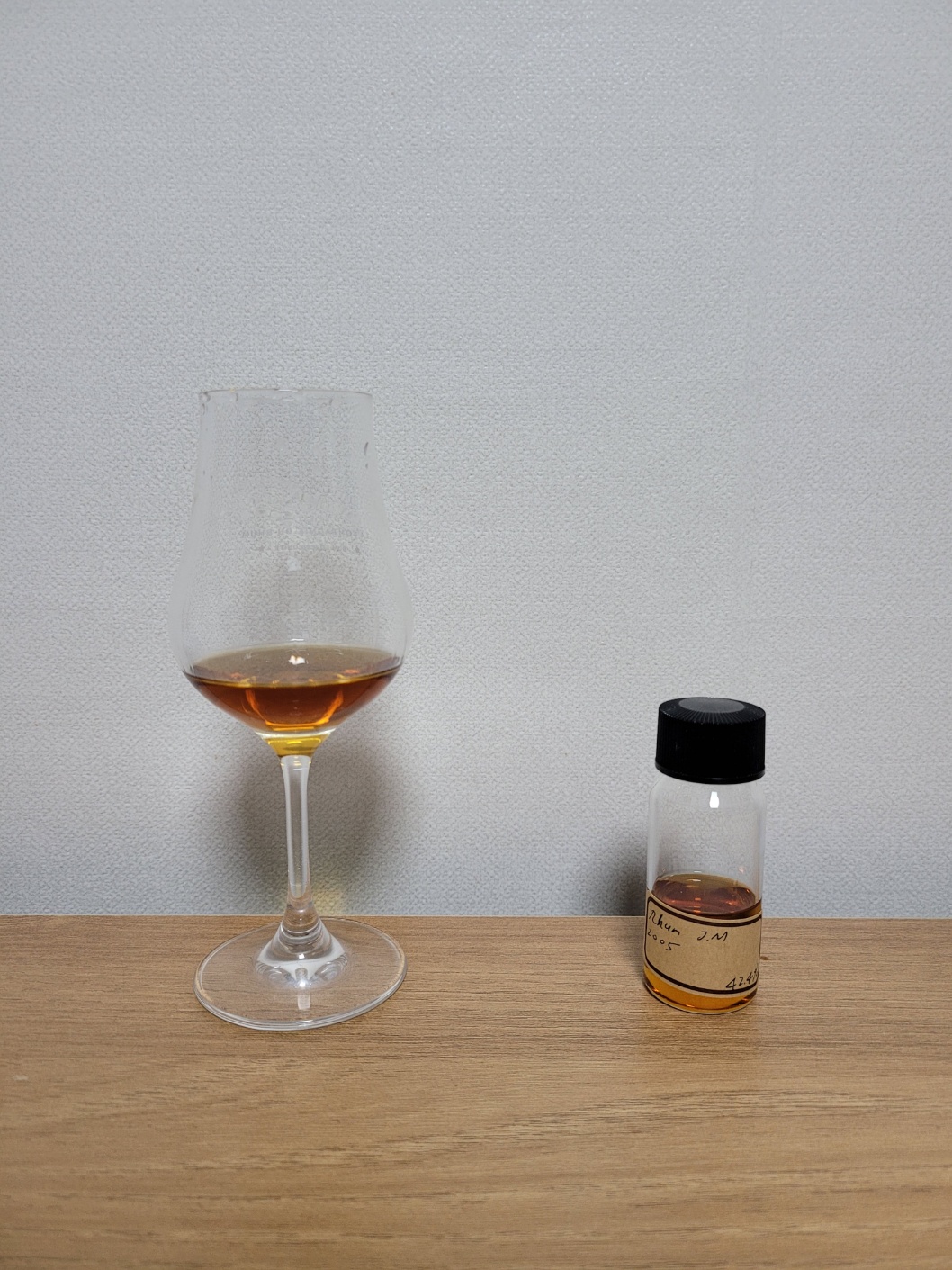 목 넘김 및 여운: 도수 대비 보다 자극적인 목 넘김이다. 루이보스 오렌지티와 여러 발효차의 뉘앙스 그리고 사과나무칩의 훈연향이 비강을 가득 메운다. 이후 육두구, 시나몬, 진저에일, 건살구, 사워도우 향이 두껍고 짧게 이어진다. 혀에는 진하게 우려낸 홍차의 탄닌감 내려앉으며 향신료의 알싸함 나타나 텁텁해지는 경향이 있다. 이후 단물이 다 빠져가는 쥬시후레쉬껌과 마루가와 멜론껌 그리고 채수의 감칠맛이 매우 미약하게 남는다.