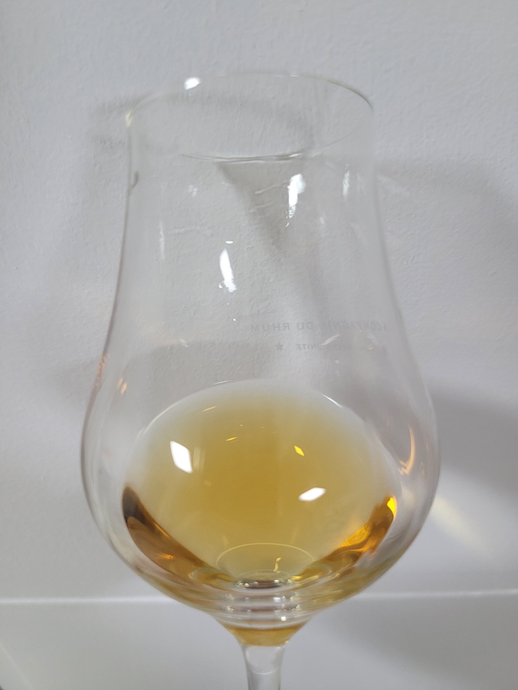 색: 황동색을 띠며 레그는 잔 중간에 맺혀 매우 천천히 떨어진다.