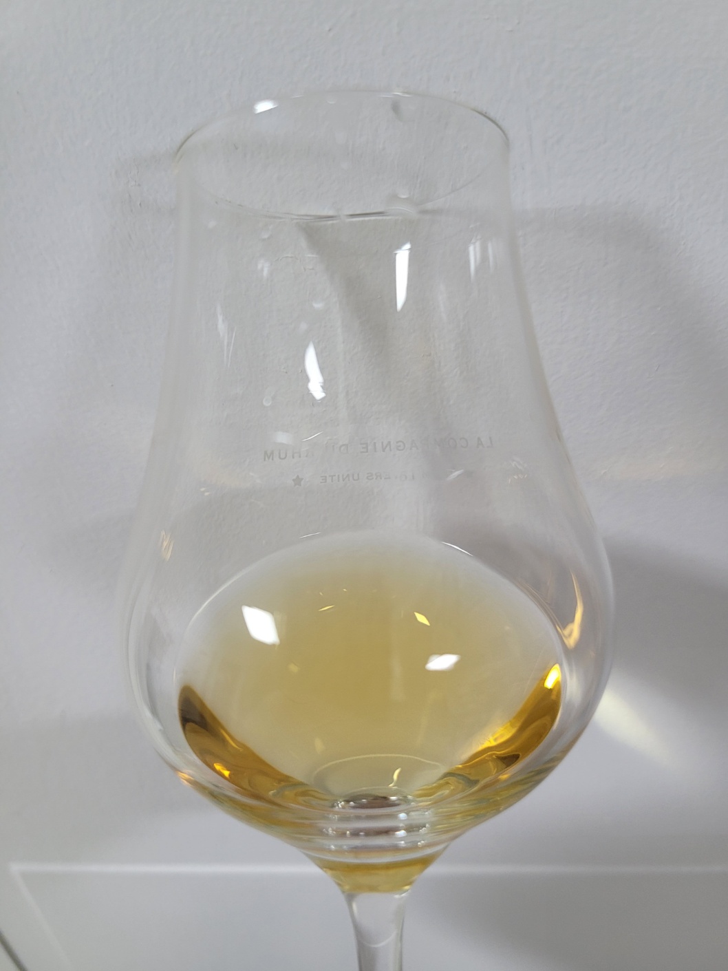 색: 황색에 가까운 살짝 누런빛을 띠며 레그는 잔 중간에 맺혀 매우 천천히 떨어진다.