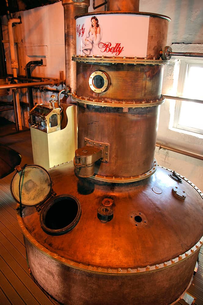 증류소의 스틸룸 안에는 구리로 이루어진 팟 스틸 3쌍이 있다. 각 증류기는 전통적인 양파 모양을 띠고 있으며 환류구(Reflux Ball)가 없다. 또한 응축기와 이어져 있는 라인암(Lyne Arm)은 매우 가파른 하향식을 띄고 있어 환류를 최소화한다. 알코올 증기 속 무거운 화합물들이 더 많이 포함되면서 보다 기름지면서도 크리미 한 질감에 꿀이나 과일의 단맛이 부여된다. 연간 약 600만 리터 이상의 순수 알코올을 생산한다.