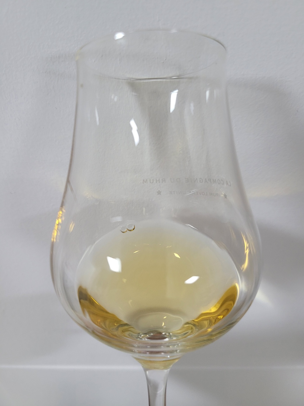 색: 금빛을 띠며 레그는 잔 중간에 맺혀 매우 천천히 떨어진다.
