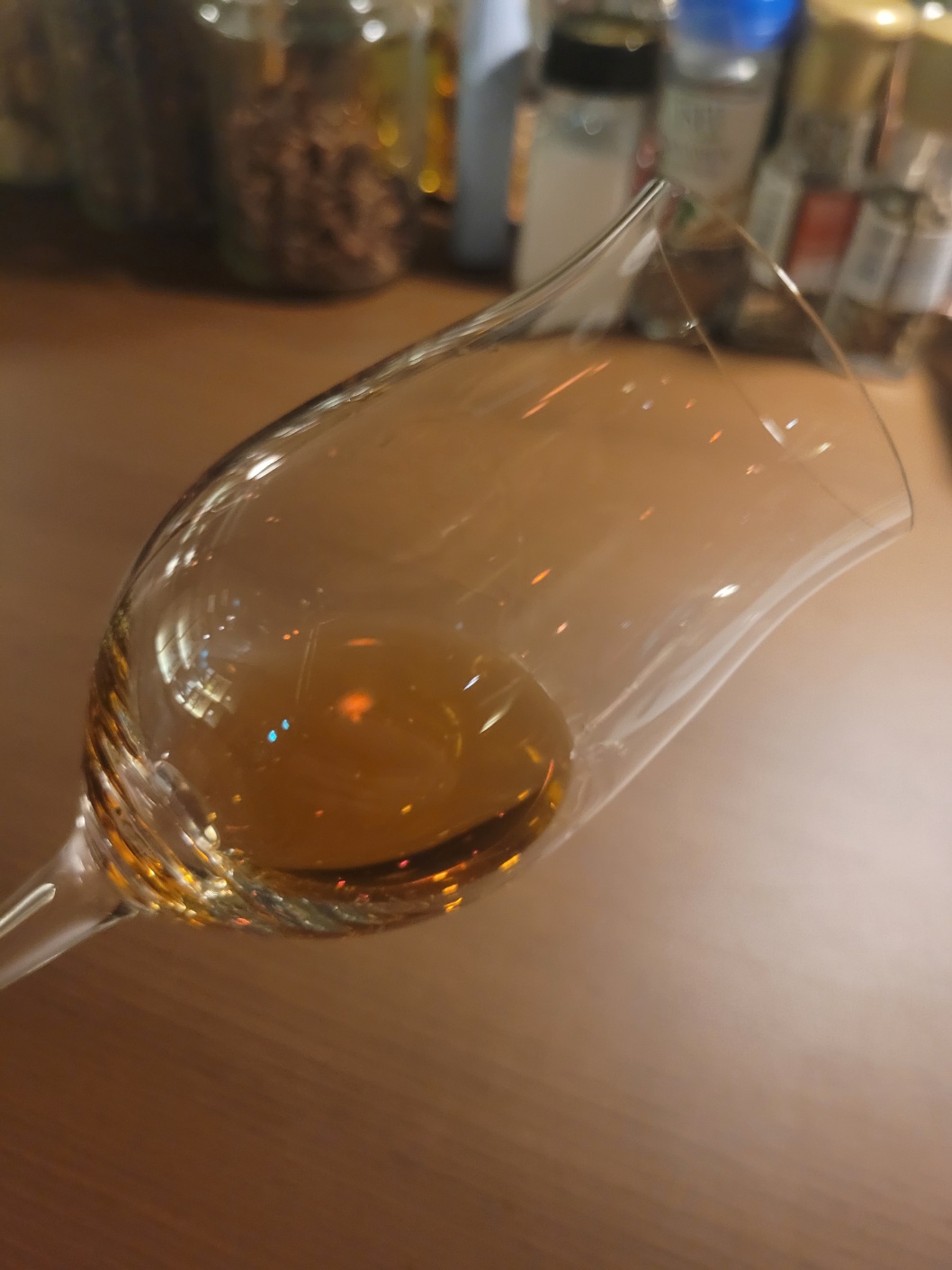 목 넘김 및 여운: 부드러운 목 넘김이다. 말린 정향과 육두구 그리고 제비꽃내음이 비강을 살포시 메웠다가 빠르게 사라지고 황설탕, 진저에일, 포도줄기 냄새가 짧고 굵에 나타난다. 혀에는 삼류의 쓴맛, 마른 허브럽드, 반건조 무화과의 풍미가 느껴지며 서양감초 및 황설탕을 머금은 듯한 약간의 잔당감이 있다.