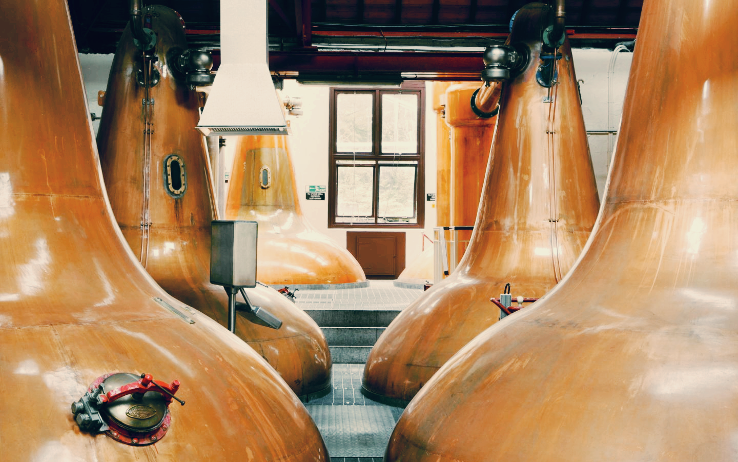 증류소 내부의 스틸룸에는 구리로 이루어진 총 3쌍의 팟 스틸이 있다. 두 증류기 모두 양파 모양을 하고 있으며, 넓은 구형 둘레와 위로 올라갈수록 매우 좁아지는 원뿔 형태를 띠고 있다. 환류구(Reflux Ball)가 없지만 워시 스틸과 스피릿 스틸의 용량 차이가 많이 차이 나지 않으면서도 용량 자체는 큰 편이라 더 많은 환류가 일어난다. 대신 백조 목(Swan Neck)과 이어지는 완만한 하향식의 라인 암(Lyne Arm)은 과도한 환류가 이루어지지 않도록 한다. 덕분에 가볍고 달콤하면서 미디엄 바디의 캐릭터를 증류액에 부여한다. 이중 증류 및 미들컷을 통해 알코올 도수 약 67 ~ 68%의 뉴 메이크 스피릿이 탄생하며 연간 약 600만 리터의 순수 알코올을 생산할 수 있다.