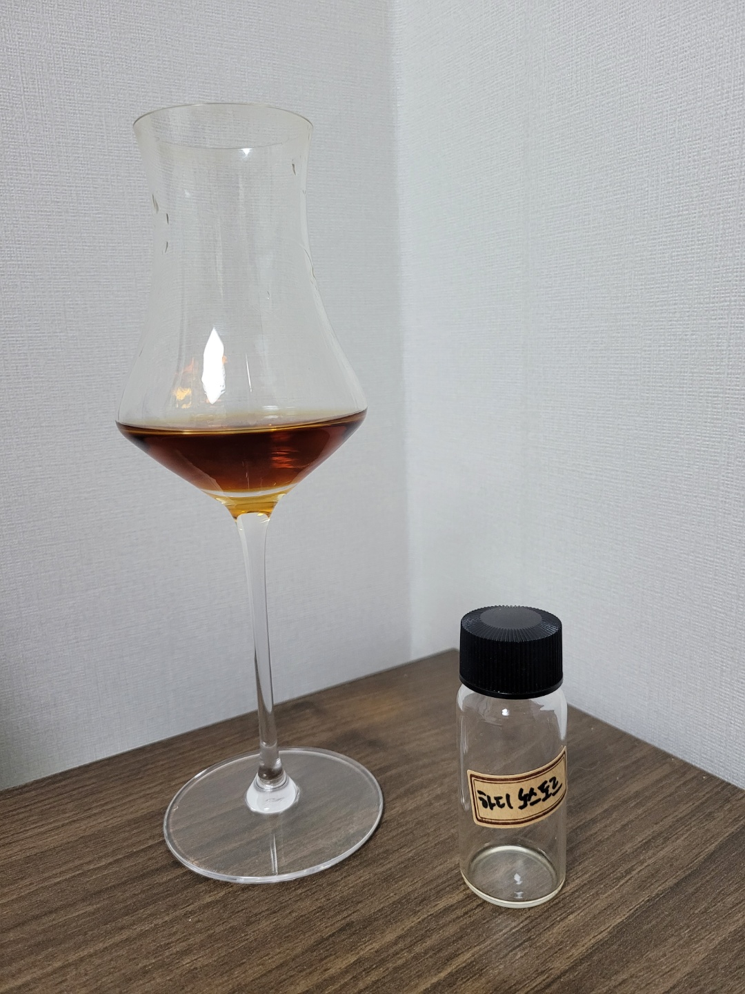목 넘김 및 여운: 목 넘김은 의심에 여지 없이 매우 부드럽게 넘어간다. 코에는 전체적으로 짙은 나무 가구의 냄새가 은은하게 맴돈다. 혀에는 탄닌을 비롯해 카카오 99%의 쓴맛이 직관적이면서 길게 남는다. 도수가 5% 만 더 높았어도 원액 자체를 망쳤을 것이라고 생각한다.