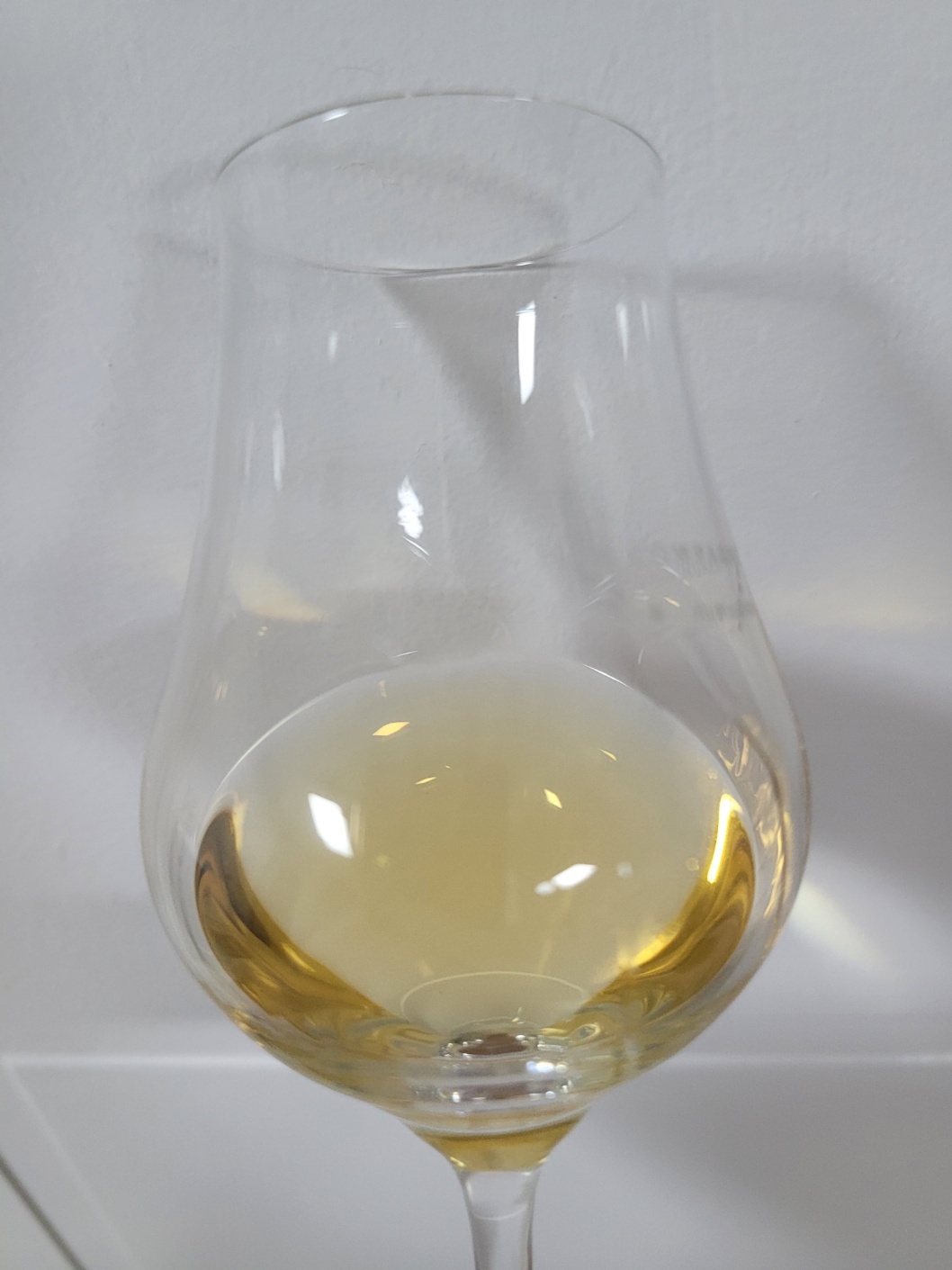 색: 샛노란 빛을 띠며 레그는 잔 중간에 맺혀 매우 천천히 떨어진다.