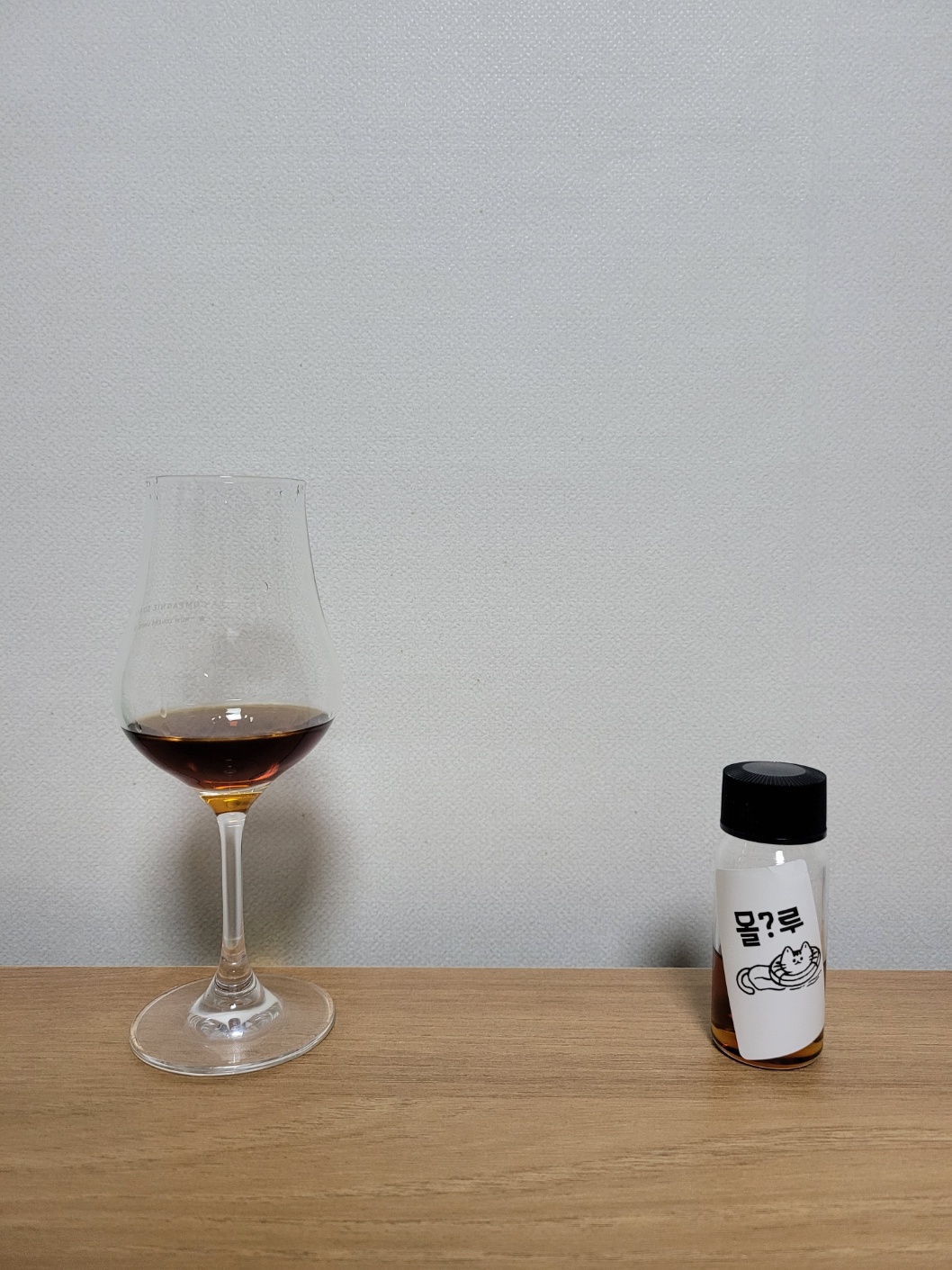 공기와의 접촉이 길어질수록 새까만 톤의 안개가 서서히 잦아들긴 하나, 강도의 차이지 전체적인 분위기는 그대로 유지된다. 마른 신문지, 말린 보이차 찻잎, 담뱃잎, 쿰쿰한 부엽토, 카카오 함량이 높은 다크초콜릿, 호두정과의 향이 올라온다. 준수한 복잡성과 볼륨감을 지녔으며, 올드스쿨 셰리몰트를 무척 닮았다.