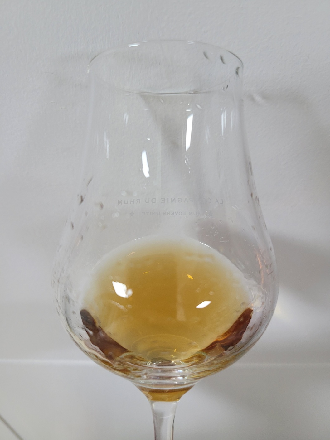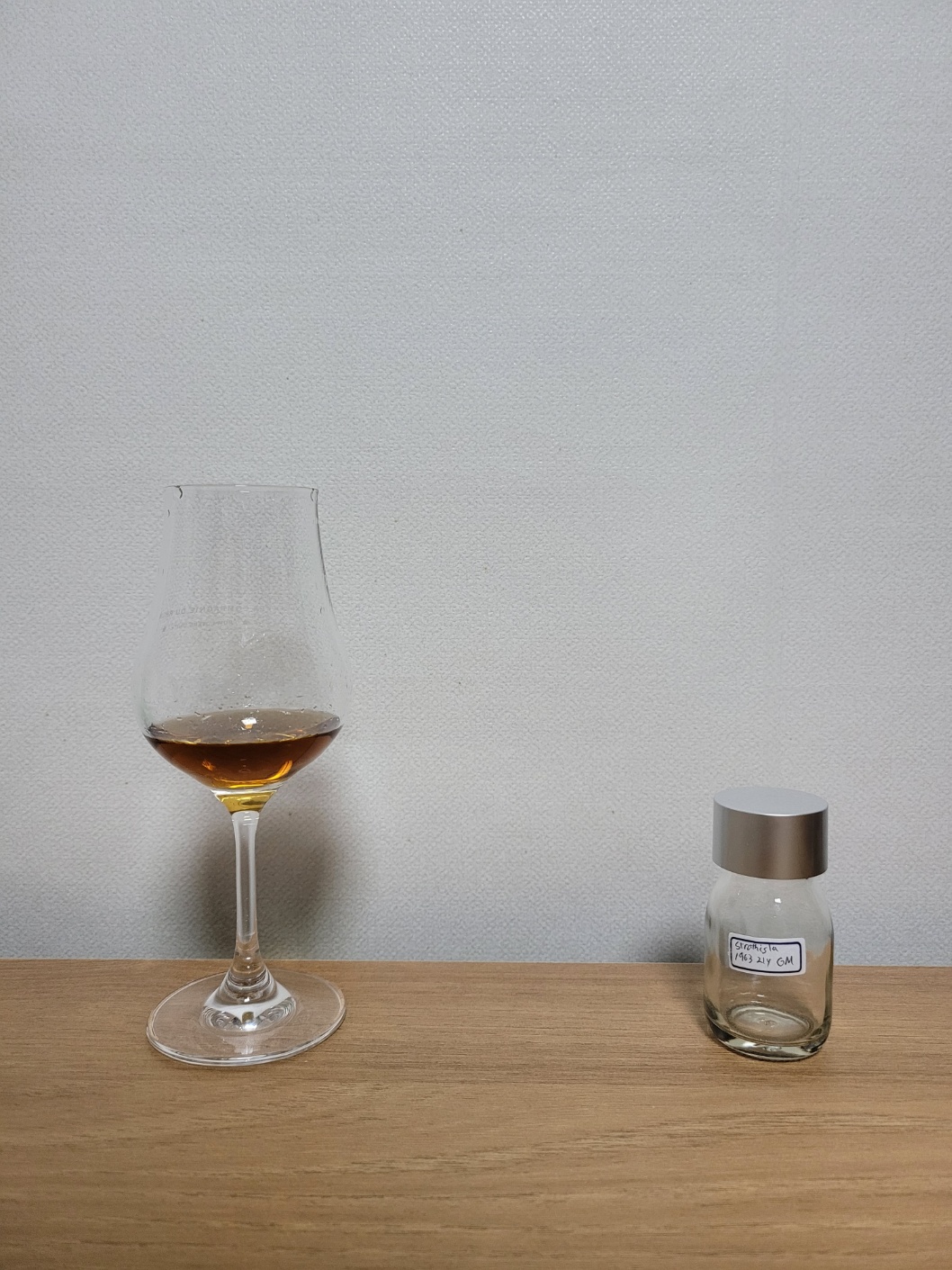목 넘김 및 여운: 부드러운 목 넘김이다. 넘기는 순간부터 말린 정향, 흑후추, 페퍼민트 등의 화하면서도 알싸한 느낌이 비강에 퍼진다. 이후 세무가죽, 고급스러운 코코아 파우더, 반건조 무화과, 마른 신문지의 향이 무척 가늘고 길게 이어진다. 혀에는 몰티져스 초콜릿과자의 풍미가 노골적으로 남는다. 이후 미티한 감칠맛과 서양감초의 단맛 그리고 약간의 떫은 느낌이 남아 드라이하게 마무리된다.