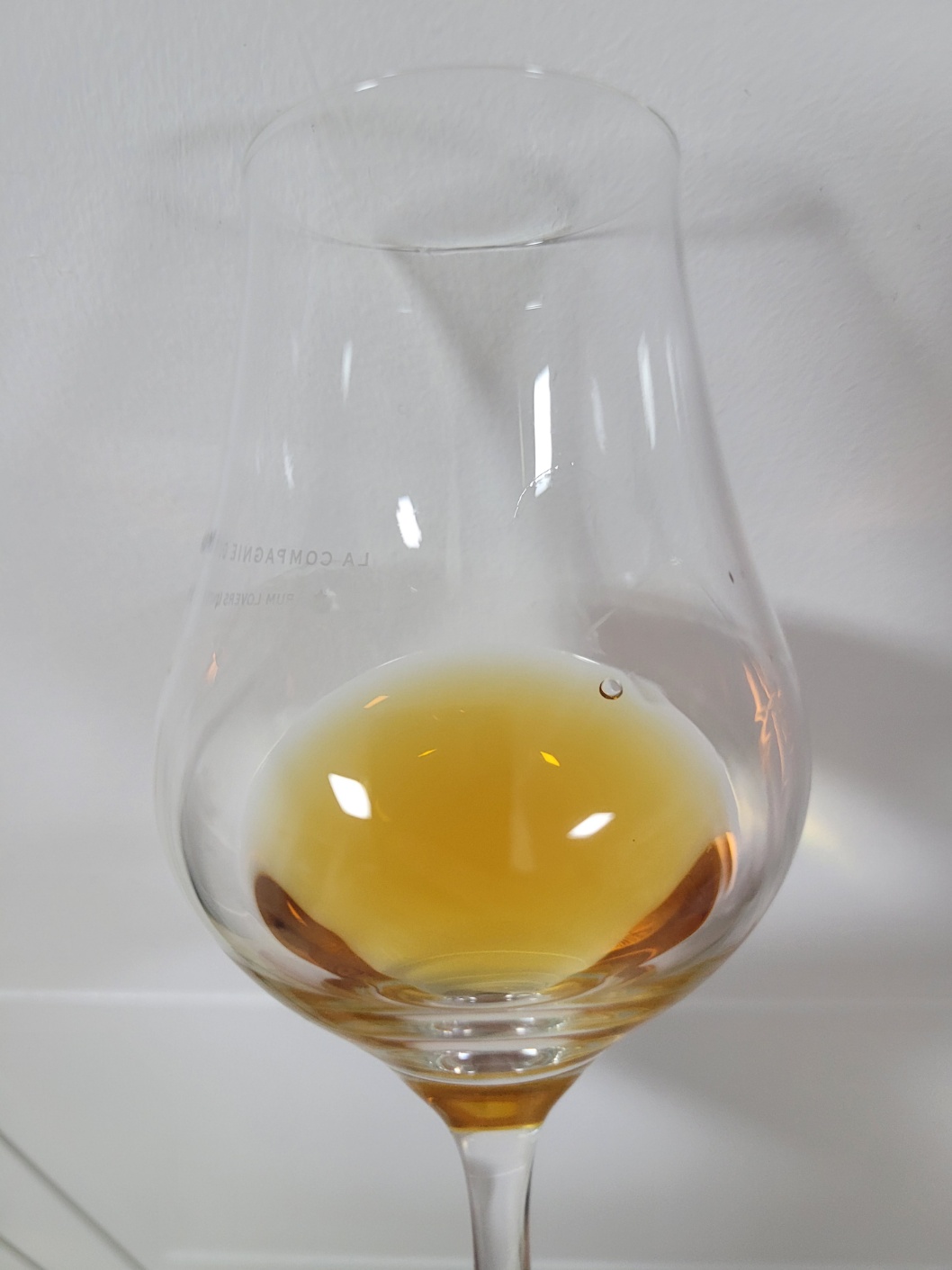 향: 알코올 자극은 덜하나, 에스테리한 느낌이 서려있다. 약간의 광택제 뉘앙스와 디젤 그리고 용매가 훑고 지나가면 송홧가루, 사과파이, 캐러멜, 자두, 황도복숭아, 버터와 같이 튀겨낸 팝콘, 오렌지 제스트를 넣고 구운 파운드케익, 얼그레이 피칸파이의 향이 올라온다. 높은 숙성 년수에 비해 향신료 뉘앙스는 절제되었으면서 생과의 느낌은 생생하게 표현했다.