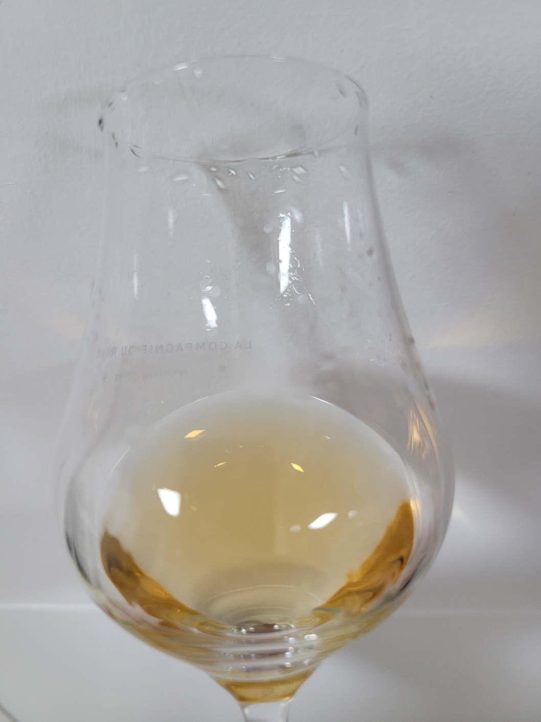 목 넘김 및 여운: 살짝 자극적인 목 넘김이다. 버섯, 꼬릿한 황치즈쿠키, 살구와 멜론을 넣은 과일치즈, 마른 허브럽드, 육두구, 백후추, 스카치캔디, 건초 풋내가 비강을 가득 메운다. 이후 하얗게 탄 재, 약품 냄새, 페놀릭한 뉘앙스, 강렬한 짠내음이 길게 이어진다. 혀에는 짠맛이 다른 모든 것을 압도할 정도로 나타나지만, 시간이 지나면서 건과일의 농축된 단맛과 치즈의 감칠맛 구운 파인애플의 산미가 올라온다.