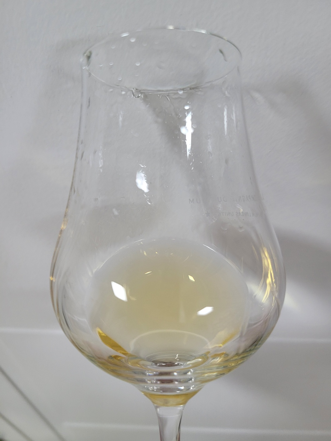 색: 샛노란 빛을 띠며 레그는 잔 중간에 맺혀 매우 천천히 떨어진다.
