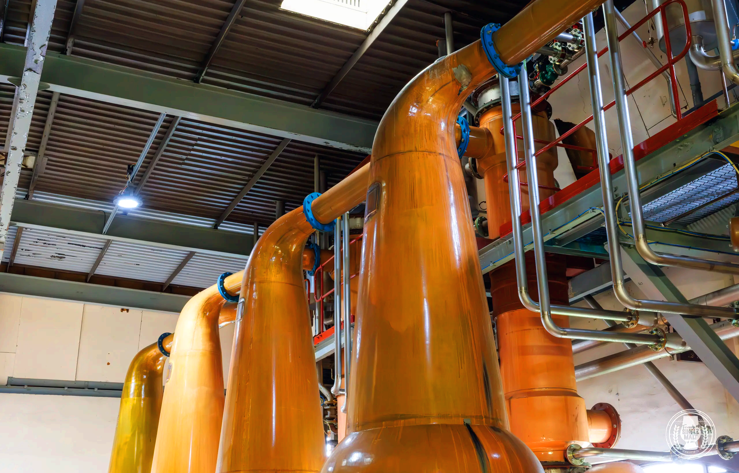 맥아즙은 2개의 워시 스틸을 통과하면서 약 6시간의 증류 과정과 농축 과정을 거치면서 약 6,500 ~ 7,000리터의 로우 와인(Low Wine)이 생성된다. 로우 와인은 다시 4개의 스피릿 스틸 중 2개로 분배된 후 다시 2차 증류와 농축 그리고 미들컷 과정을 통해 2,650리터 x2 및 알코올 도수 약 68 ~ 70%의 뉴 메이크 스피릿이 탄생한다. 연간 약 400만 리터의 순수 알코올(LPA)을 생산할 수 있다.
