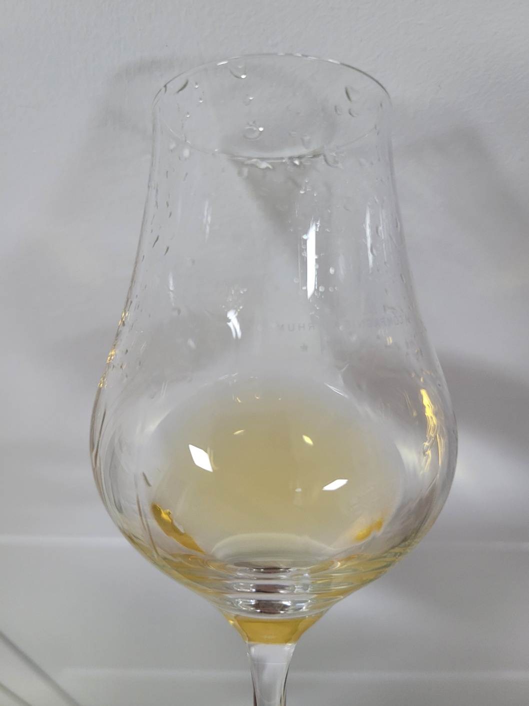 목 넘김 및 여운: 살짝 자극적인 목 넘김이다. 선이 가는 바닐라, 휘핑크림의 밀키함, 약간의 박과류 뉘앙스, 식도에서부터 톡 톡 치고올라오는 듯한 오묘한 펑크, 소금기가 비강을 잠깐 메운 뒤에 하얗게 탄 재의 뉘앙스와 붕대 냄새 그리고 갓 튀겨낸 듯한 플레인팝콘의 향이 가늘고 길게 이어진다. 혀에는 쌀과자를 씹는 듯한 단맛과 풍성한 감칠맛, 기분 좋은 짠맛, 혀가 가볍게 자극될 정도의 미약한 산미가 내려앉는다.