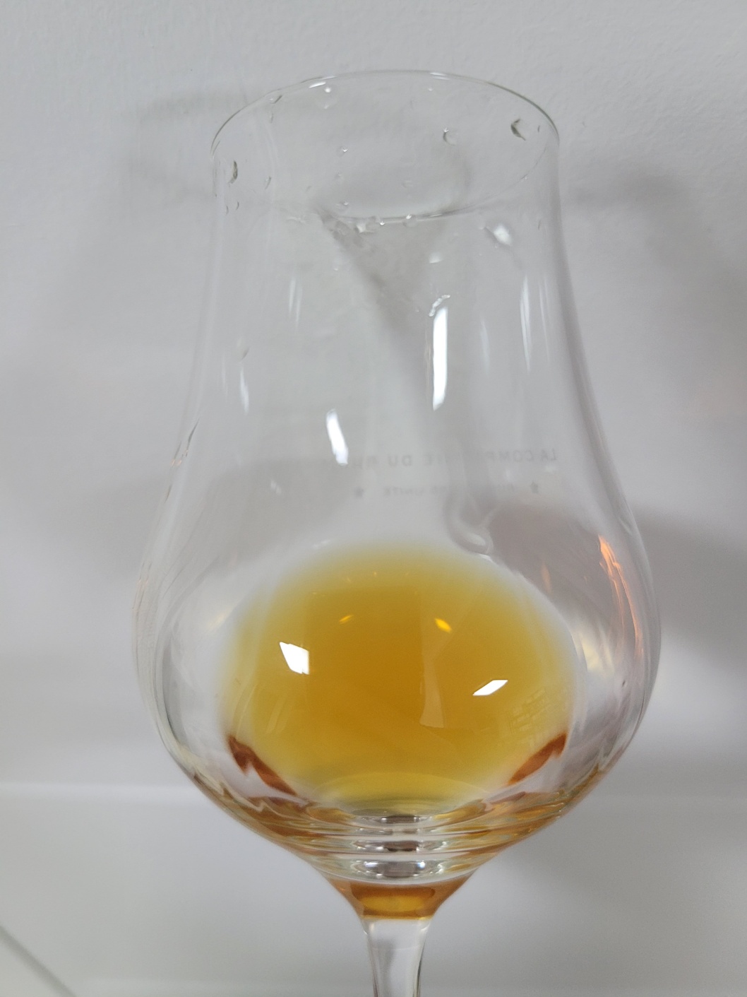 목 넘김 및 여운: 자극적인 목 넘김이다. 약간의 광택제 뉘앙스와 함께 알코올이 터진다. 이후 가라앉고는 감귤류와 핵과류의 새콤달콤한 느낌이 한 데 섞여 비강을 가득 메우며 마른 허브럽드, 캐러웨이, 오렌지 루이보스티, 귤껍질, 네롤리, 살구 따위가 굵고 길게 이어진다. 혀에는 살짝 눅눅하면서도 생동감이 있는 핵과류의 산미가 입 안 이곳저곳에 달라붙는다. 이후 쌉싸름한 귤락과 블러드오렌지의 단맛이 내려앉아 오랫동안 잔류한다. 여운의 볼륨이 무척이나 풍성하다.