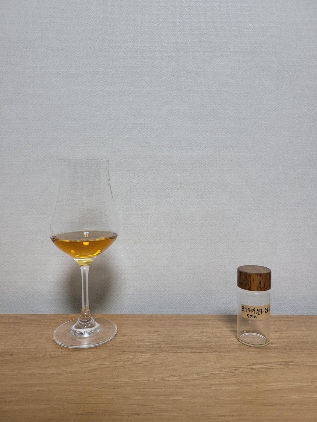 목 넘김 및 여운: 도수에 비해서는 덜 한 자극의 목 넘김이다. 썩어 문들어져가기 시작한 낙엽, 감자 껍질, 쿰쿰한 토란, 커피땅콩, 그레이엄 크래커, 숯불에 구워낸 표고버섯의 향으로 비강이 가득 찬다. 이후 바싹 튀겨낸 부각의 탄내음 살짝과 짠내음 그리고 담뱃잎이 가늘고 길게 이어진다. 혀에는 짠맛이 한바탕 헤집고 난 뒤에는 풍성한 감칠맛, 구운 곡물에서 오는 투박한 단맛, 카카오닙스의 쌉쌀한 느낌이 내려앉아 꽤나 오랫동안 유지된다.