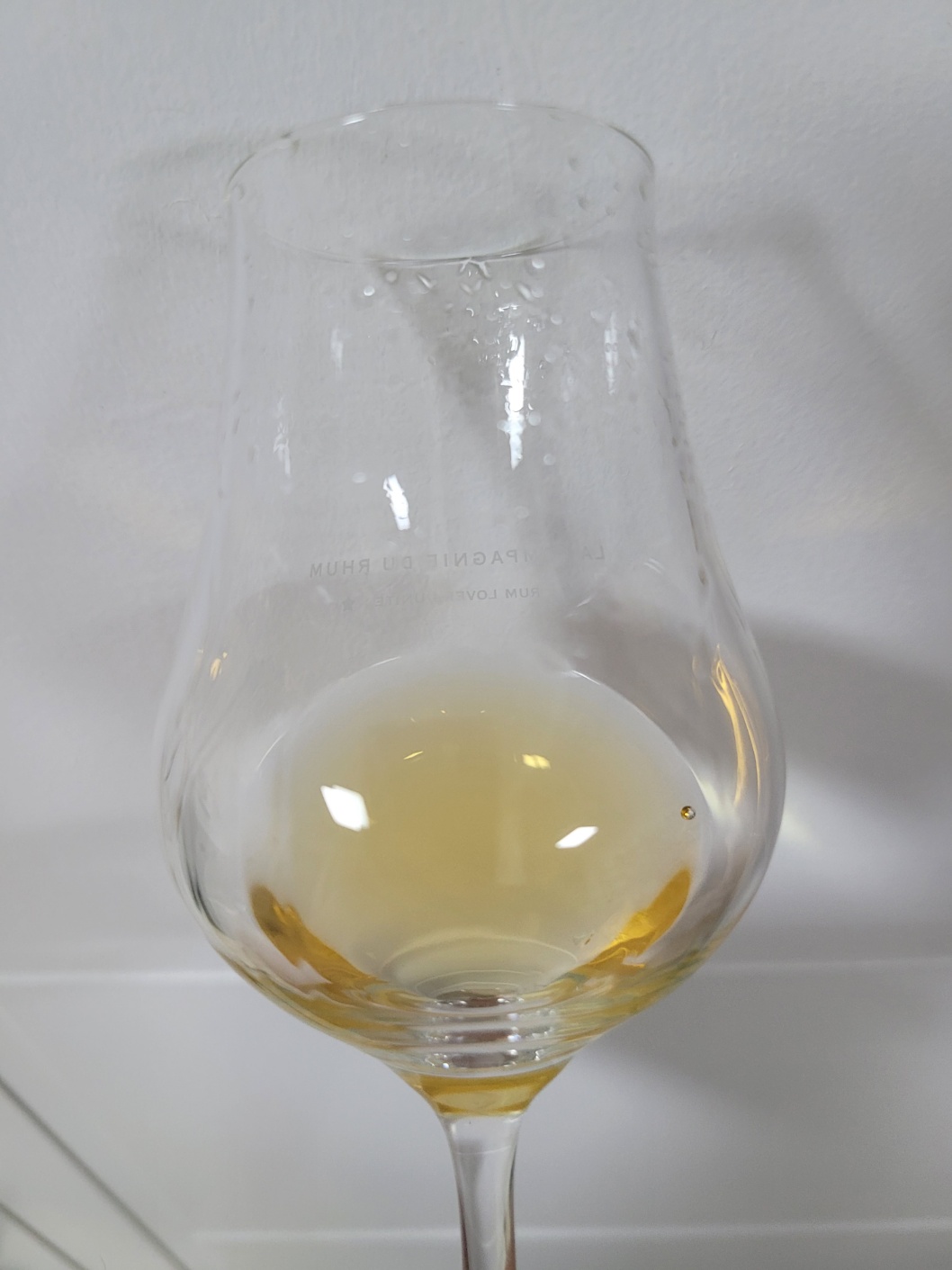 색: 금빛을 띠며 레그는 잔 중간에 맺혀 매우 천천히 떨어진다.