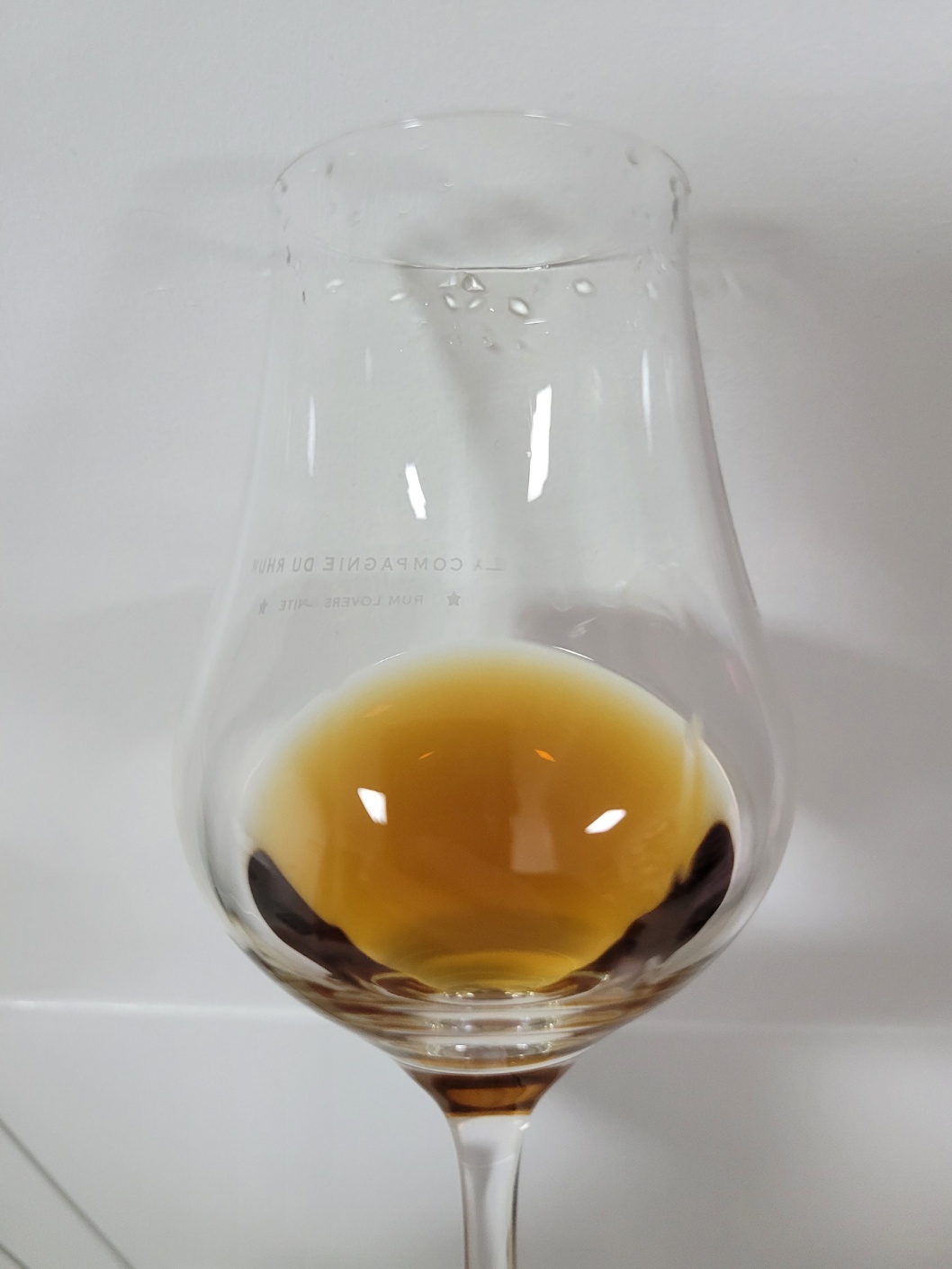 목 넘김 및 여운: 부드럽지만 살짝 뻑뻑한 목 넘김이다. 코코아 파우더, 말린 정향, 흑후추, 담뱃잎, 랍상소총, 흑연, 크레파스 등 파우더리 하면서도 스모키하고 드라이한 느낌이 비강을 가득 메운다. 이후 체리 콜라와 에스프레소 그리고 약간의 화독내가 무척 가늘고 길게 이어진다. 혀에는 적포도 껍질스러운 탄닌 떫은 느낌, 코코아 파우더 및 흑후추 따위가 응어리진 듯한 텁텁함, 미약한 탄맛이 너무 두껍지 않게 내려앉는다. 이후 검은 과실의 산미와 극미세한 단맛이 잇몸 사이사이에서 꿈틀거린다.