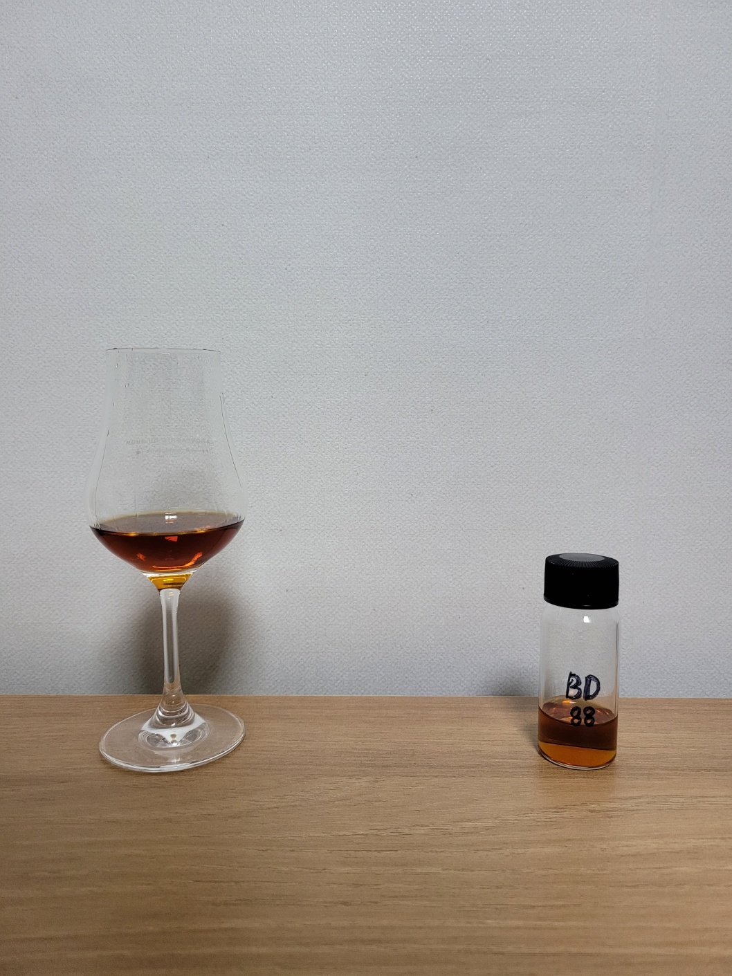 향: 숨을 크게 들이쉬어야 알코올의 기운이 느껴지기 시작한다. 축축하고, 음습하며, 어두운 톤의 향조로 가득 차있는데, 마치 자외선살균기에 오래 둔 스뎅컵의 냄새 같기도 하다. 앤티크/고가구에서 느껴질 법한 강한 우디(Woody)와 약간의 광택제 뉘앙스, 블랙베리, 블랙체리, 건푸룬, 라즈베리맛 투시팝스 막대사탕, 유지방 속의 단백질과 당분이 마이야르 과정을 거친 브라운 버터, 흑설탕을 졸였을 때 나는 달콤함과 미약한 화독내, 떡질 정도로 코코아 파우더로 완전히 버무린 트러플 초콜릿 또는 초코퍼지, 볶은 헤이즐넛과 아몬드에서 느껴지는 고소하고 풍부한 향, 얼그레이 피칸파이, 노골적인 에스프레소보다는 연한 원두커피 같은 쌉싸름한 향과 브라운에일의 뉘앙스, 은은한 체리나무칩 훈연향이 올라온다.