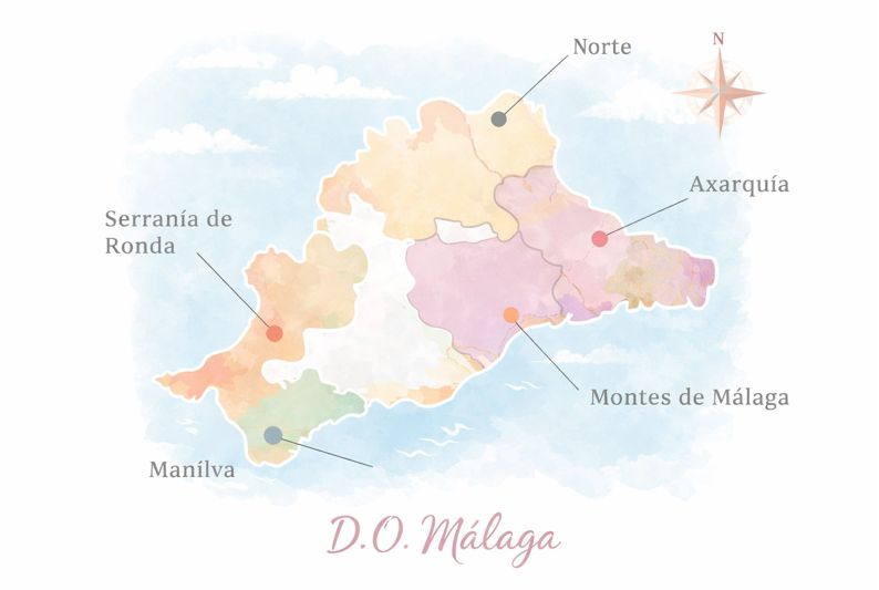 스페인 남부 안달루시아 지방에 위치한 도시 말라가에서 유래한 이 달콤한 주정강화 와인은 시에라 데 알미하라(Sierra de Almijara)를 중심으로 안테케라(Antequera), 아르치도나(Archidona), 산 페드로 알칸타라(San Pedro Alcantara), 벨레스 말라가(Velez Málaga) 그리고 콤페타(Competa)에서 생산된다. 이 지역은 지중해와 맞닿은 따뜻한 해안, 석회질 토양, 높은 일조량 등에 혜택을 입어 당도 높은 포도를 얻을 수 있었다. 오랜 생산의 역사는 1933년 헤레스와 함께 스페인 최초의 원산지 보호(DO) 중 하나로 지정되는 계기가 되었다.