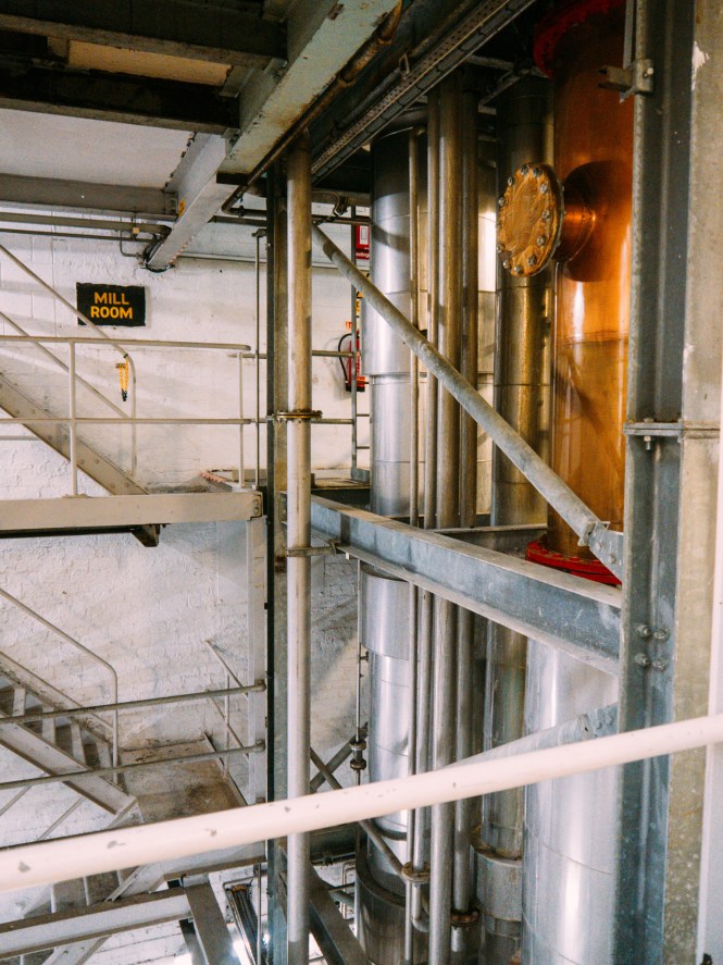 증류소 내부에는 팟 스틸 외에도 그레인 위스키 생산을 위한 연속식 증류기 세 쌍이 위치해 있다. 1994년 증류소 확장을 통해 설치된 두 쌍의 연속식 증류기는 은색 스테인리스 스틸로 외부가 마감되어 있으며, 정류 컬럼 상부 일부에는 황을 비롯한 기타 화합물 제거를 위해 구리로 코팅되어 있다. 한 쌍의 증류기는 각 분석 컬럼(Analyser Column)과 정류 컬럼(Rectifier Column) 시스템으로 구성된다.