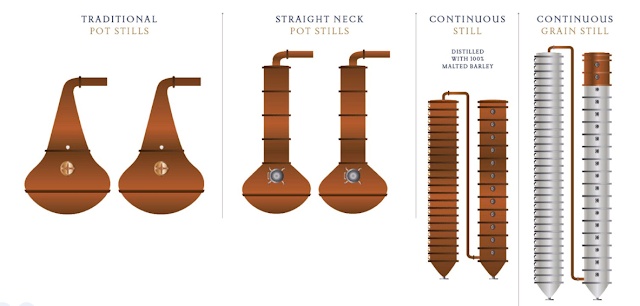 일부는 전통적인 스완넥 모양의 팟 스틸을 워시 스틸로, 스트레이트 넥 팟 스틸을 스피릿 스틸로 하여 이중 증류하며, 일부는 스트레이트 넥 팟 스틸 두 개를 한 쌍으로 하여 이중 증류한다. 경우에 따라 라인암(Lyne Arm) 각도를 조절하고, 구리로 이루어진 다공성 플레이트와 냉각링(Cooling Ring)을 통해 환류를 높일 수 있다. 연간 약 500만 리터의 순수 알코올(MLPA)을 생산할 수 있다.