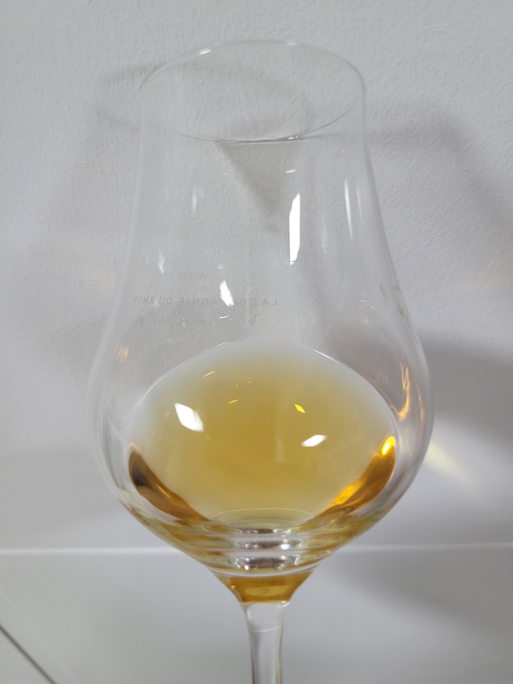 색: 호박색을 띠며 레그는 잔 중간에 맺혀 매우 천천히 떨어진다.