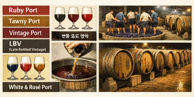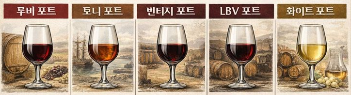 포트 와인은 숙성 기간과 종류에 따라 다양한 스타일로 구분될 수 있다. 루비 포트(Ruby Port)는 산화를 최소화한 형태의 포트 와인으로, 주로 큰 오크통이나 스테인리스 스틸 및 콘크리트로 이루어진 대형 저장 용기에서 숙성된다. 공기 접촉을 최소한으로 하여 병입 전 약 2 ~ 3년 정도를 숙성하여 고유의 색과 과실 향을 유지한다. 일부 리저브 루비(Reserve Ruby) 또는 LBV 등의 프리미엄 제품군 병입을 위해서 약 4 ~ 6년의 더 오랜 숙성을 수행하기도 한다. 병입 전에는 정제 및 저온 여과를 거친다.