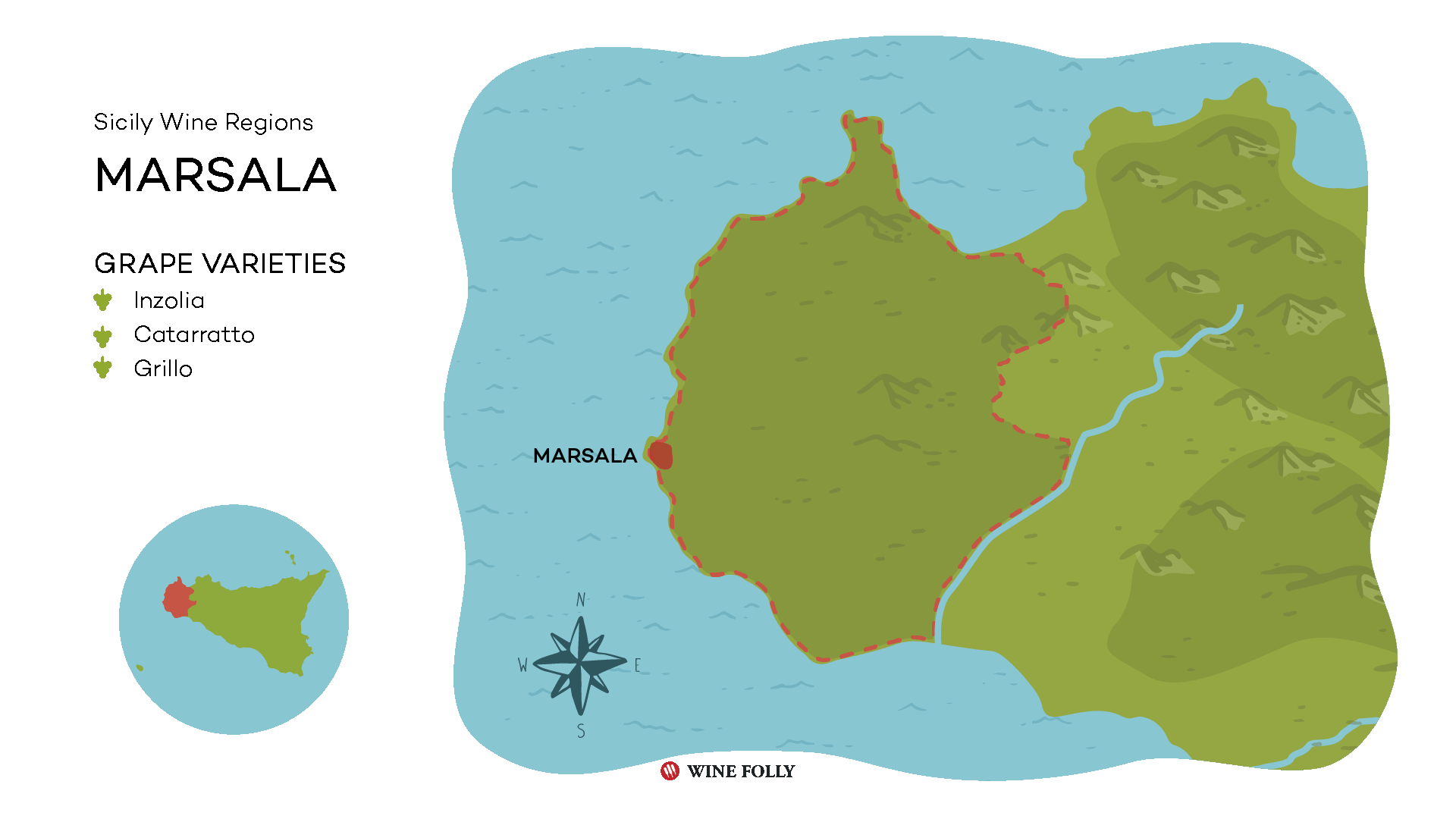마르살라 와인은 마르살라라는 정체성 그 자체인 그릴로(Grillo) 품종을 중심으로 여러 개의 백포도 품종과 적포도 품종이 사용된다. 카타라토(Catarratto)와 무스카트 알렉산드리아(Muscat Alexandria)의 토착 생물형인 지삐뽀(Zibibbo) 사이의 교배종인 그릴로는 높은 산도, 산화 안정성, 장기 숙성 능력이 뛰어나 사실상 절대다수를 차지하며, 그릴로 단일 또는 그릴로를 중심으로 블렌드를 더하기도 한다.