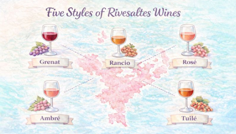 Rivesaltes AOC is a French Appellation d'Origine Protégée (AOP) for Vin Doux Naturel (VDN), a category of sweet fortified wines produced primarily from Grenache grape varieties (noir, blanc, and gris) and Macabeu in the Roussillon region of southern Fran