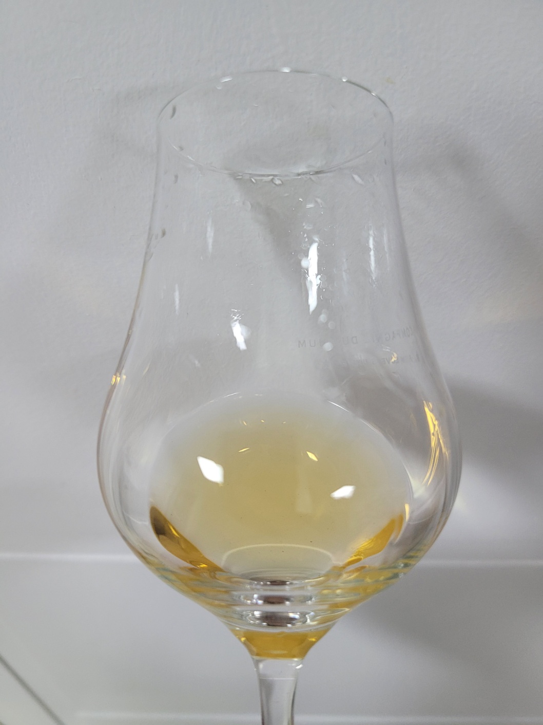 목 넘김 및 여운: 살짝 자극적인 목 넘김이다. 캐러멜과 아몬드 페이스트(Marzipan) 그리고 이 둘에 톡 쏘는 듯한 시큼함이 더해진 몰트 비네거, 갈아 만든 배와 배 껍질의 향, 우롱차, 미약한 스모키, 무화과 러스크, 호밀빵의 향이 따위가 무척 굵고 길게 이어진다. 혀에는 쥬시한 산미가 빠르게 흩어지고, 설탕에 조린 과일의 달콤함이 서서히 올라온다. 동시에 배 껍질의 꺼끌꺼끌한 탄닌과 구수한 단맛이 느껴진다. 무척 기분 좋은 마무리다.