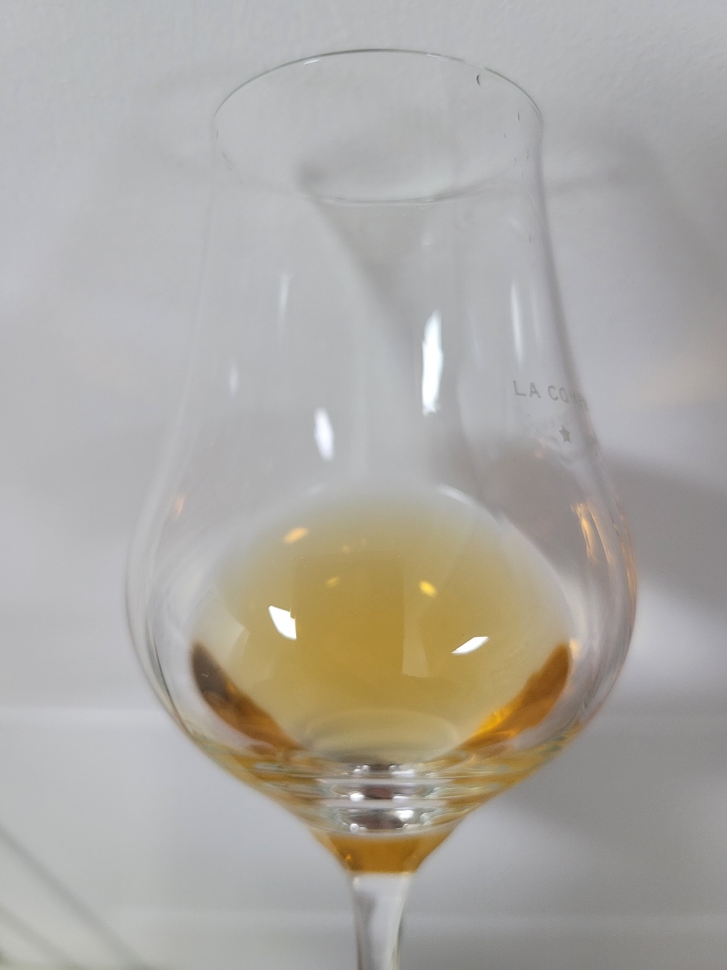 색: 누르스름한 황색을 띠며 레그는 잔 중간에 맺혀 매우 천천히 떨어진다.