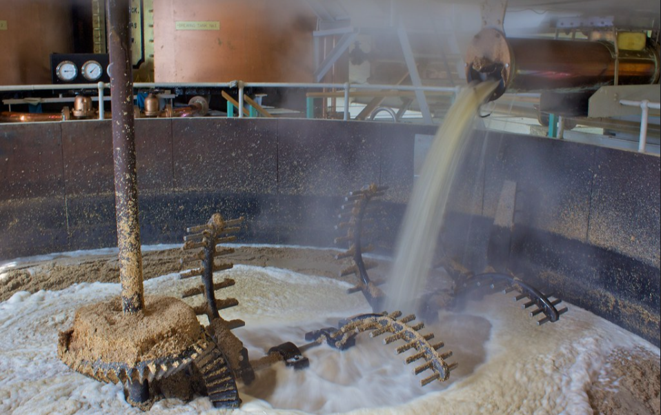곱게 가루로 분쇄된 몰트는 빅토리아 시대의 "Flat Bottm & Open Top" 매쉬 튠(Mash Tun)에서 뜨거운 물과 혼합되어 당화된다. 물이 배수되고 남은 매쉬는 나무로 된 45,000리터 용량의 워시 백(Wash Back) 6개에 모리 및 케리 효모(Mauri & Kerry)와 투입되어 약 75 ~ 80시간 동안 발효된다.