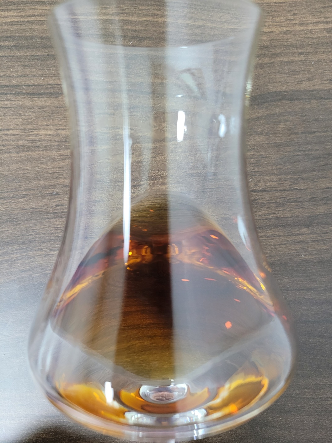 향: 알코올이 강하게 치며 향이 꽉 막혀있다. 20분의 기다림 끝에 어느정도 피어오르기 시작한다. 진한 오크터치에 럼레이즌의 달콤함, 다크초콜릿이 느껴진다. 정향과 화자오의 알싸함이 그윽하게 올라오나 불쾌할 정도는 아니다. 올로로소 셰리 캐스크 특유의 견과류 고소함은 보이지 않는다. 몰트의 개성도 캐스크에 대부분 잠식되었다. 감귤류의 시트러스가 강하다. 공기와의 접촉이 더 길어질수록 캐러멜라이징한 양파와 불에 구워 눌러붙은 바나나의 달콤함과 화독내가 느껴진다. 네모난 팩포도즙을 연상케도 한다. 젖은 신문지향도 이따금씩 올라온다.
