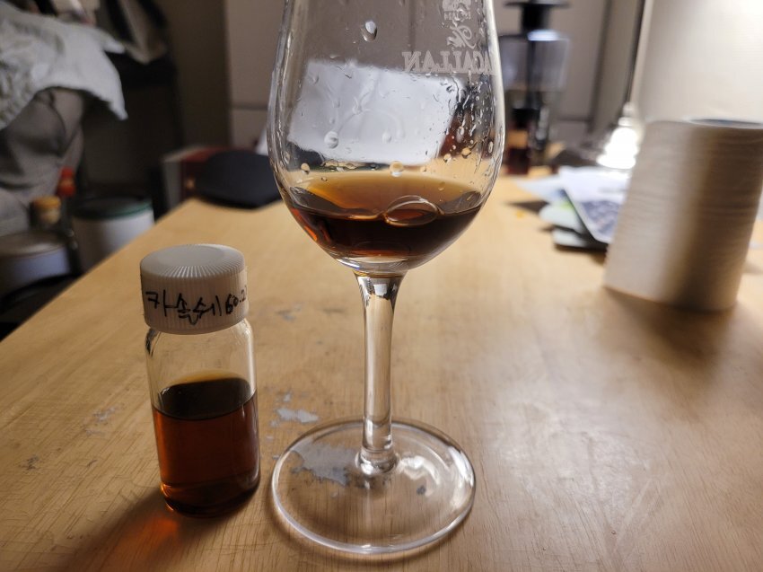 맛: 소스라칠 정도로 떫다. 포도를 먹을때 포도 줄기와 껍질 그리고 씨앗까지 꼭꼭 씹어서 나는듯한 풍미가 난다. 한약재의 쓴맛. 엄청난 드라이함. 셰리 오크통의 전부를 빨아드린듯한 강렬한 풍미다. 60도의 도수 떄문에 바디감이 매우 좋으면서도 단기간에 빨아드린 오크통의 안좋은 점들이 그 밸런스를 깨버린다. 건포도를 연상하고 싶지만, 이건 곰팡이핀 건포도다.