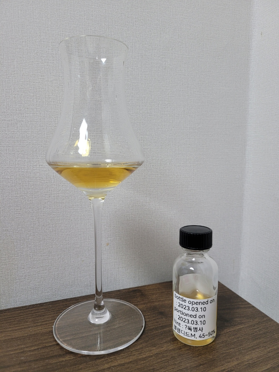 향: 알코올 자극이 강하다. 시원한 배를 중심으로 레몬 껍질의 시트러스와 청사과의 풋내가 느껴진다. 뒤로 갈수록 산화철의 쨍한 냄새와 백후추의 알싸함이 코를 간질인다. 강한 스모키를 동반한 몰트 뉘앙스가 강하게 잡힌다. 공기와의 접촉이 길어질수록 전체적인 향조가 신선한 허브로 채워진다.