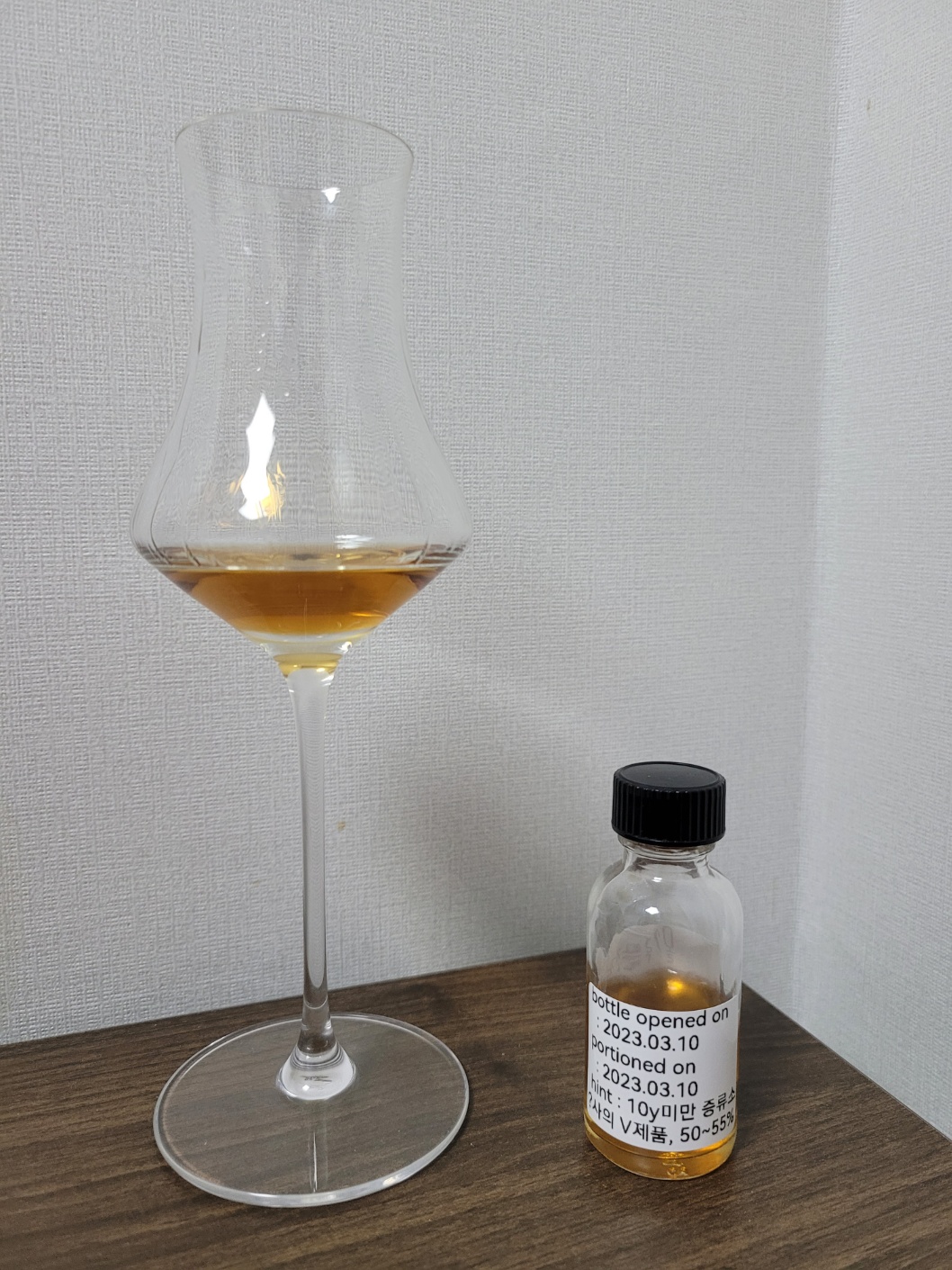 맛: 향에 비해 오크의 터치가 더 강하게 느껴지며, 주정강화와인의 꿉꿉한 풍미가 감돈다. 매실청을 머금은듯한 꾸덕한 질감과 단맛 그리고 산미가 있다. 오래 머금으면 덜 익은 바나나의 풋내와 코코넛 따위의 과일이 올라온다. 몰트의 느낌이 희미하며, 미네랄 뉘앙스가 강하다. 일체감과 밸런스가 아쉽게 느껴진다.
