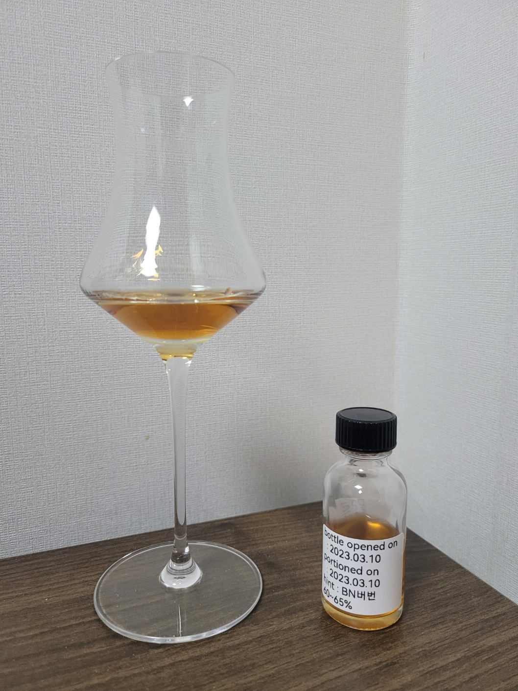 향: 코를 가득 채우는 알코올에 볶지 않은 생땅콩의 풋내가 곧바로 느껴진다. 뒤로 따라오는 바닐라와 캐러멜의 단향은 썩 유쾌하지 않다. 공기와의 접촉이 길어질수록 알맞게 익은 바나나와 코코넛 그리고 노골적인 버터쿠키향이 진득하게 올라온다. 소금기도 조금씩 느껴지는 것이 갓 구운 소금빵을 연상케 한다.