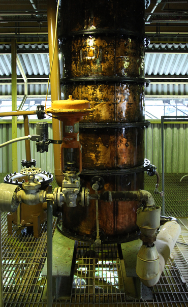 첫 번째 컬럼 증류로 나온 헤비 럼 증류액을 메인 팟 스틸에 투입하여 증류하면 각각의 레토르트 스틸을 통과하면서 농축된 알코올로 변화한다. 초류에서 본류까지의 퍼스트 컷은 알코올 도수 약 92 ~ 93%이다. 후류의 파이널 컷은 알코올 도수 약 69 ~ 70%이다. 구리 응축기에서 응축되어 최종적으로 알코올 도수 약 81 ~ 82%의 증류액이 생성된다. 증류액의 약 24%에 해당하는 초류와 후류를 후속 증류에 재사용하지 않고 처리한다.