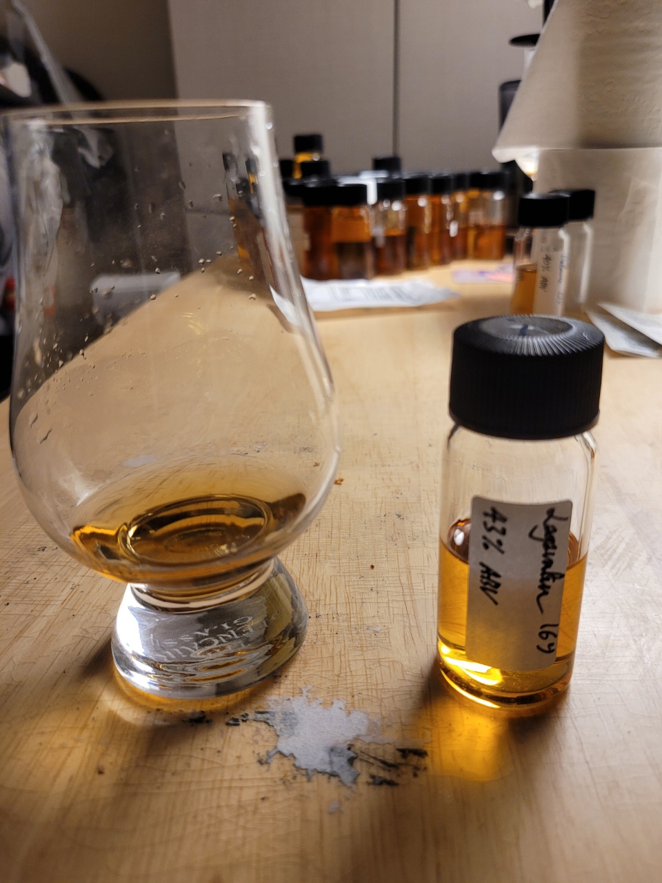 맛: 첫맛은 상당히 달달하다. 그 다음에 보리의 구수한 맛과 과실풍미가 나타난 후, 훈제 베이컨 풍미로 마무리한다. 입에서 굴리는데 상당히 오일리해서 입안 전체를 식용유로 코팅하는 느낌이 든다. 다른 아일라 증류소의 제품인 라프로익 쿼터캐스크에서는 오크통의 우디함, 떪은 맛이 약간 났었는데 라가불린 16년에서는 그런것이 전혀 없으며 밸런스와 바디감이 상당히 좋다.