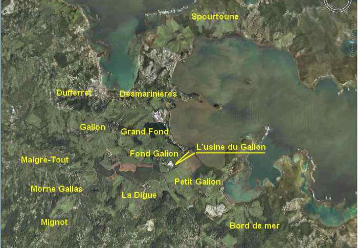 통칭 갈리옹 공장(L'Usine du Galion)은 포르 드 프랑스(Fort de France)에서 마을로 진입하기 약 1km 전인 트리니떼(Trinité) 마을에 위치하고 있다. 이곳은 마르티니크에서 현재까지 가동 중인 마지막 설탕 공장이다. 18세기 이 지역의 거의 모든 땅을 소유했던 뒤뷕(Dubuc) 가문은 자신들의 사유지를 아비타시옹 르 갈리옹(Habitation Le Galion)라고 불렀다. 1861년, 생 피에르(Saint Pierre) 시의 상인이었던 외젠 외스타슈(Eugène Eustache)는 자신의 오래된 설탕 농장이 급격하게 노후화되고 있었기 때문에 이미 사탕수수의 중심지였던 그랑 퐁(Gradns-Fonds)과 르 갈리옹 사유지를 매입하여 설탕 공장을 짓고 가동했다.