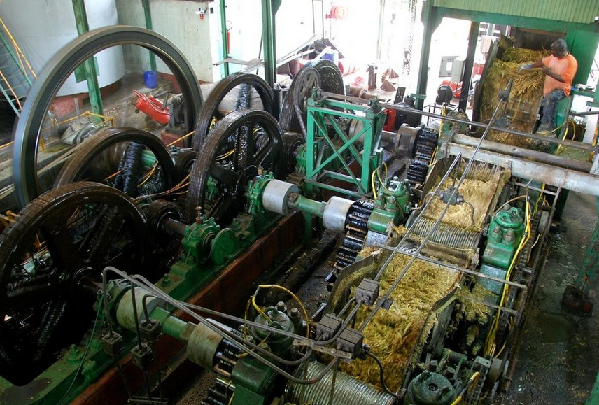 갓 수확한 사탕수수는 무게를 잰 뒤 공장에서 분쇄 및 압착되여 사탕수수 주스를 추출한다. 갓 짜낸 주스의 사용은 아그리꼴 럼의 품질을 특징짓는다. 잔류물인 바가스(Bagasse)는 1906년부터 사용한 증기기관에 동력을 공급하는 데 쓰이며, 사탕수수 분쇄기와 증류기를 작동시키는 보일러의 연료로도 사용된다.
