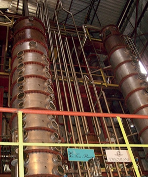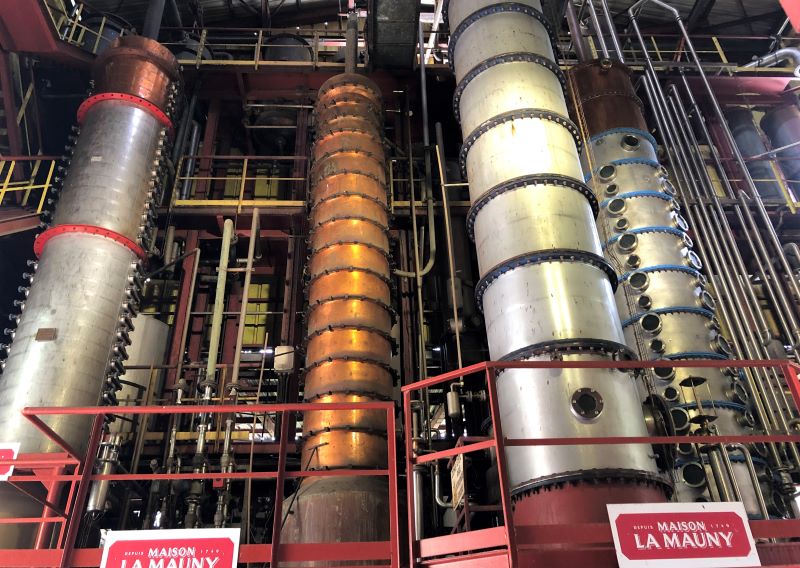 발효된 와인은 크레올 컬럼 스틸(Créole Column Still)로 보내져 알코올 도수 약 74%로 증류된다. 크레올 컬럼 스틸은 각각 구리와 스테인리스로 구성 되어있다. 같은 그룹에 속해있는 두 브랜드인 뒤껜(Duqusne)과 트루아 리비에르(Trois Rivières)의 증류액이 이곳 라 모니 증류소에서 생산된다.