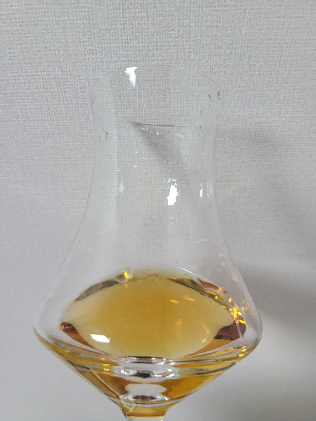 목 넘김 및 여운: 자극이 강한편이다. 코로는 바닐라와 바나나 그리고 건자두 따위가 올라오며, 혀에는 고추장 같이 금방 사라지는 매운맛이 났다가, 청사과 껍질의 탄닌에서 오는 떫은맛 약간과 바나나의 단맛이 짧게 이어진다.