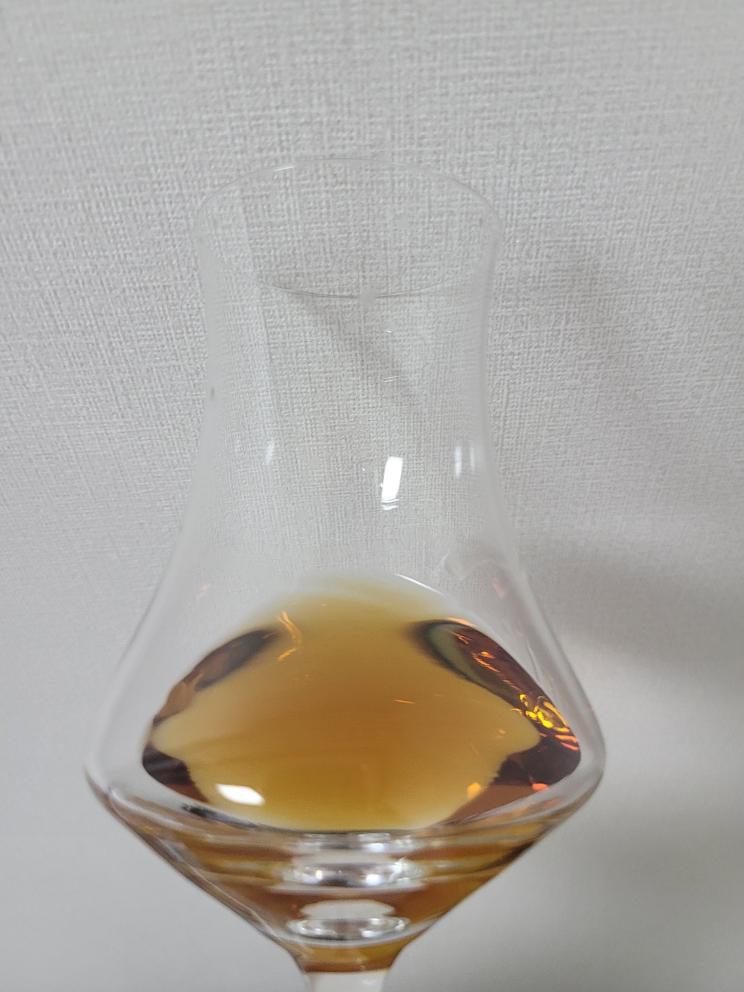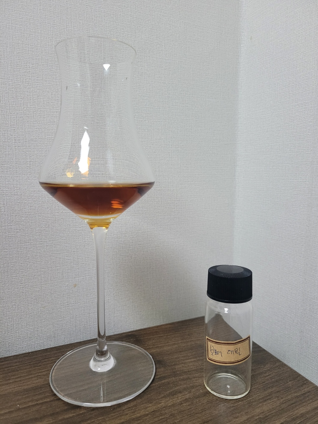 향: 알코올이 튀지는 않으나 저숙성만의 느낌이 확연하게 존재한다. 오크의 터치에 정향과 후추가 강렬하게 묻어 나온다. 쿰쿰한 흙내음에 건자두와 건포도 그리고 다크초콜릿이 나타난다. 나무 타고 남은 재와 스모키가 전자의 묵직한 향조들을 타고 사뿐하게 올라온다. 몰트 뉘앙스는 없다시피 할 정도로 캐스크의 영향이 강하게 느껴진다. 끝에 캐러멜과 홍삼 진액스러운 짙은 향이 코를 감싼다.